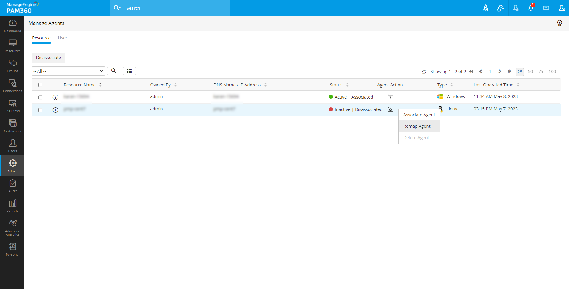 - [管理者] >> [PAM360エージェント] >> [エージェントを管理]の順に移動します。ここで、リソース/ユーザーにマッピングされたエージェントのリストを表示できます。