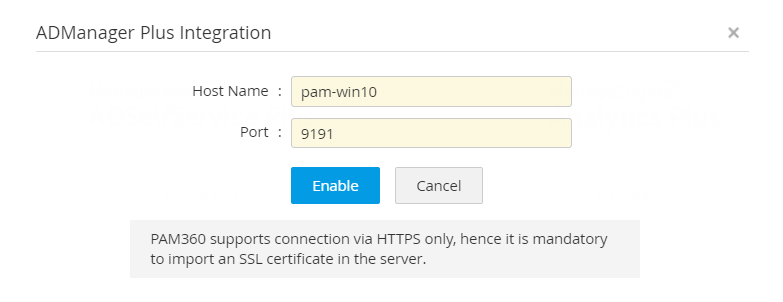 統合が無効になっている場合、このオプションが表示されます。このボタンをクリックして、ADManager Plusサーバーの必要な詳細を入力し、統合を有効にします。 |