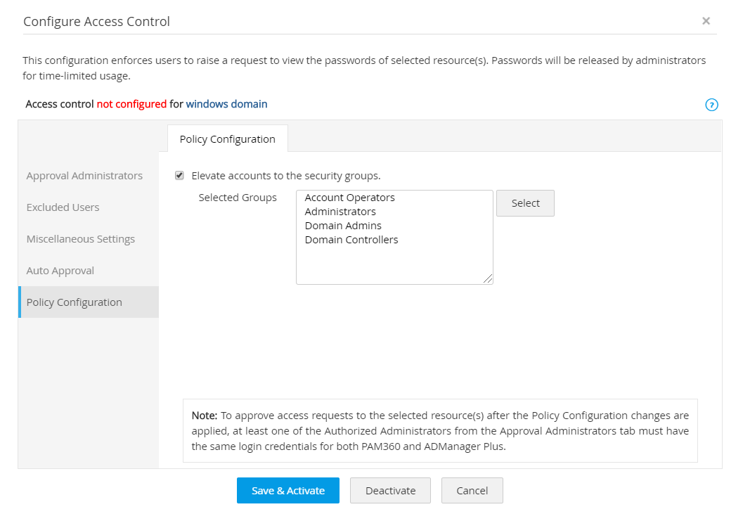 - グループが[アクセスlコントロール] >> [ポリシー構成],で表示されない場合は、PAM360 Windows Domainコントローラーリソースのドメイン名フィールドをチェックしてください。
