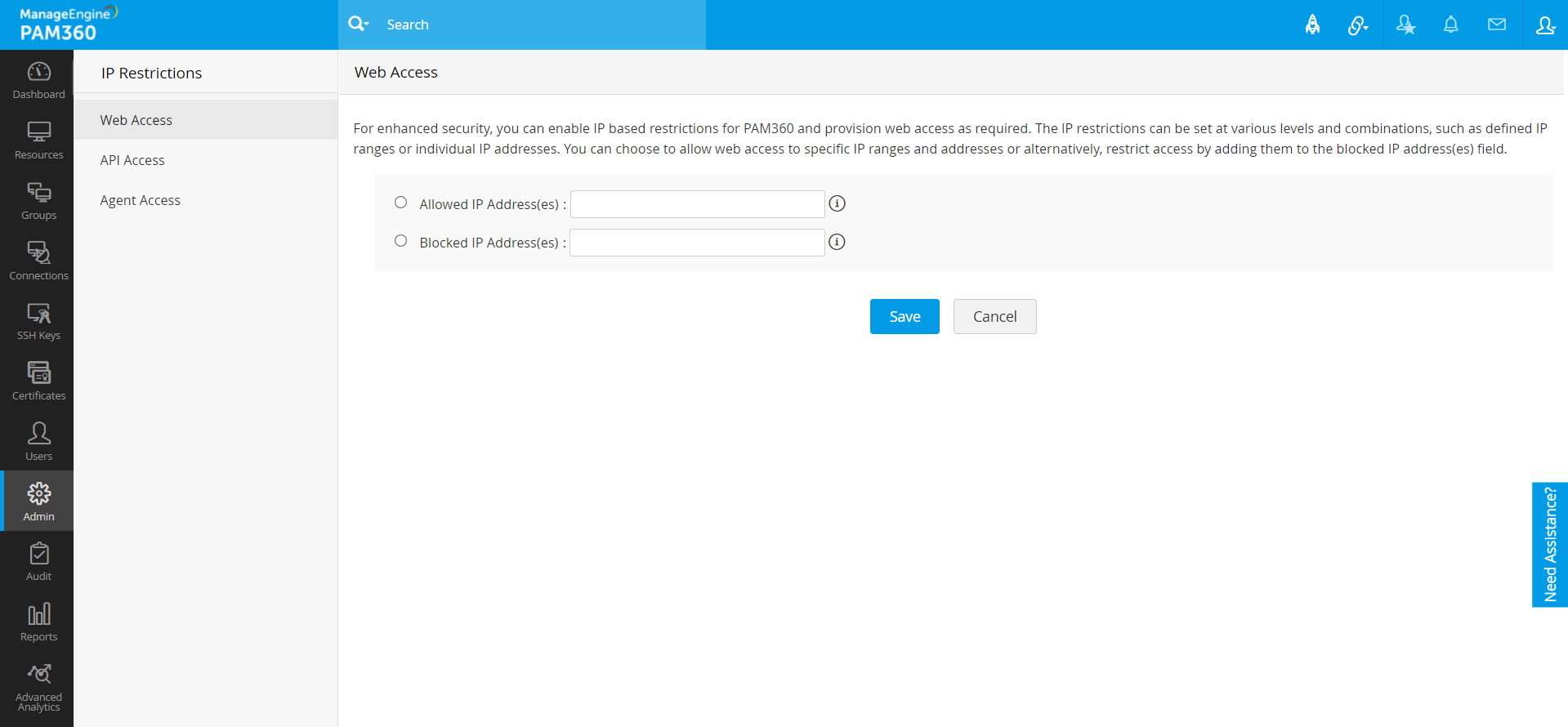 PAM360 WebサーバーへのアクセスにIPベース制限を有効にできます。IP制限は、定義済みのIP範囲や個々のIPアドレスなど、さまざまなレベルと組み合わせで設定できます。