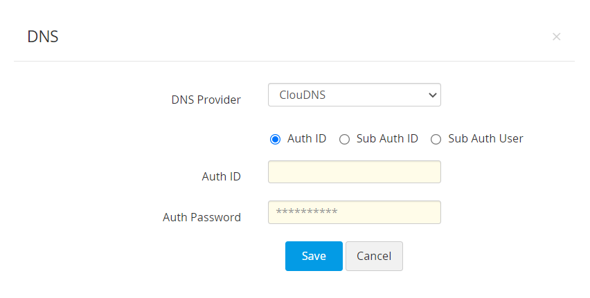- 選択したClouDNS認証IDとそれぞれの認証パスワードを入力し、[保存]をクリックします。