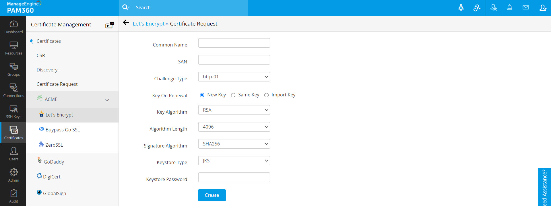 Let's Encrypt CAの証明書をPAM360インターフェイスから直接、要求、調達、展開、監視、追跡および更新できます。