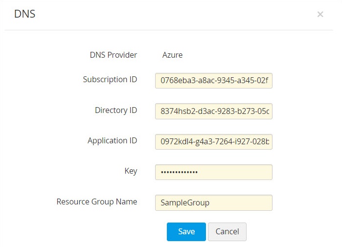 - DNSプロバイダーを選択します。Azure DNSの場合、必要な詳細(サブスクリプションID、ディレクトリID、アプリケーションID、アプリケーションキー、およびリソースグループ名)を入力します。