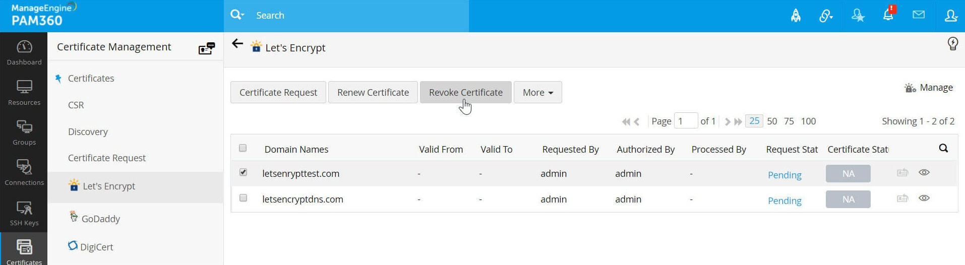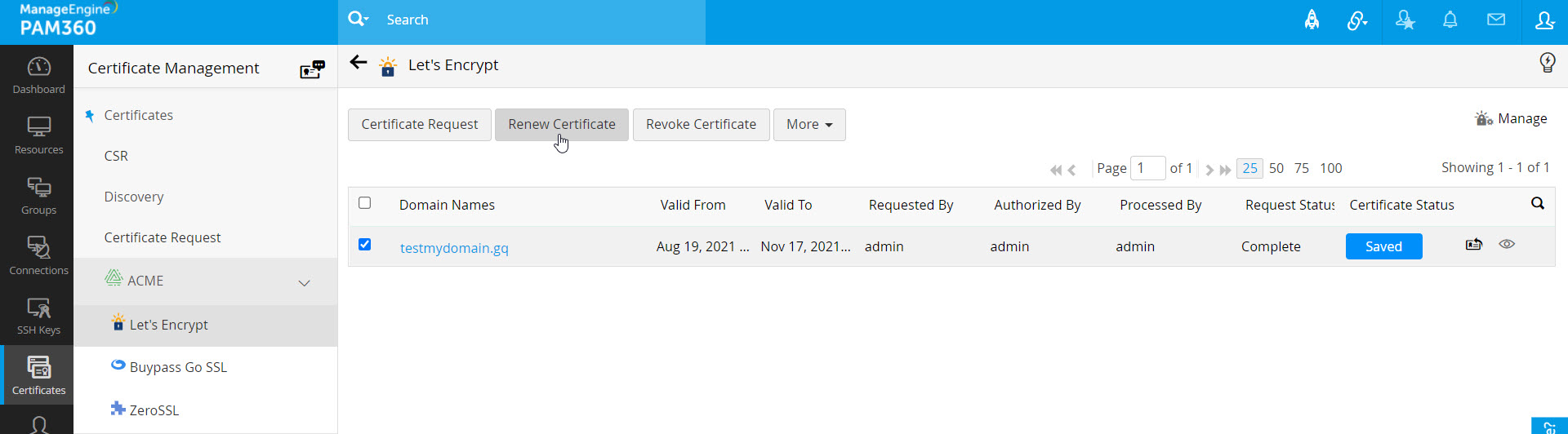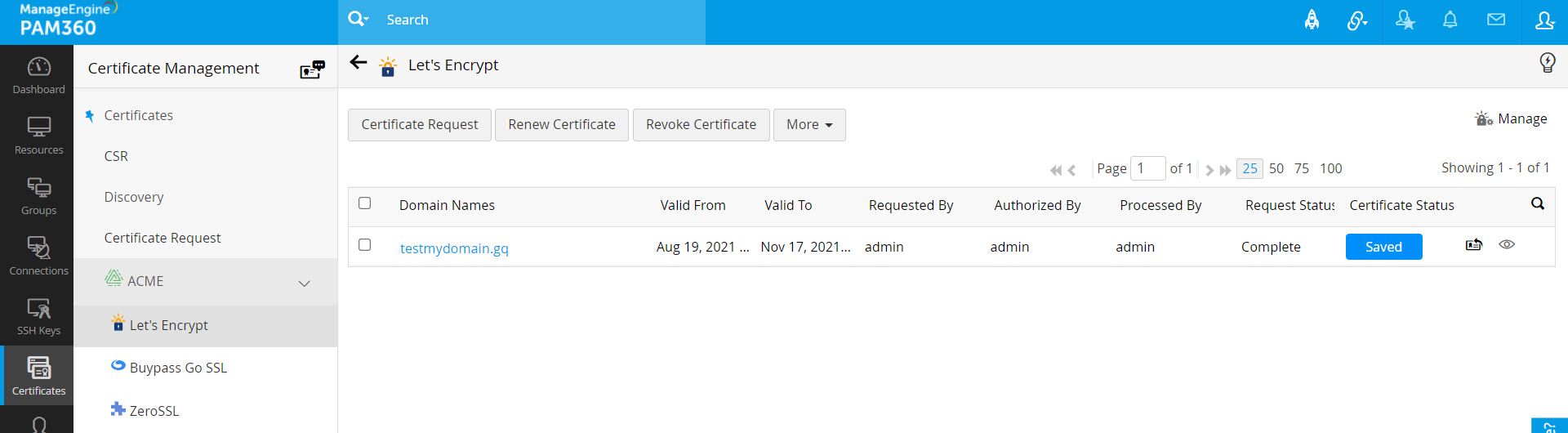 )]をクリックして別のチャレンジのセットを取得し、上記のプロセスを繰り返します。 - 保存時、証明書がPAM360リポジトリに追加されます。この内容は、[証明書] >> [証明書]タブで表示できます。