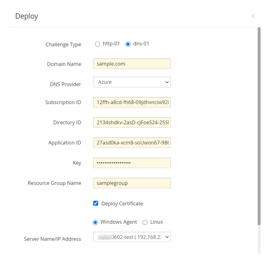 - linuxエンドサーバーでは、必要な詳細を入力しますが、Windowsエンドサーバーでは、Windowsエージェントを、http-01 challenge.チャレンジに記載したのと同じプロシージャを使って、ダウンロードおよびインストールします。