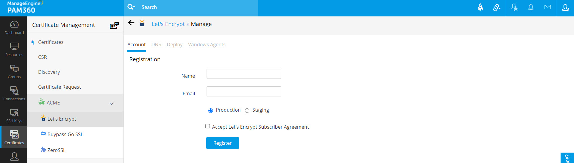 Let's Encrypt CAに証明書を要求する最初の手順は、Let's Encryptを使用してアカウントを作成することです。これは、一回限りのプロセスで、PAM360インターフェイス自体から実行できます。