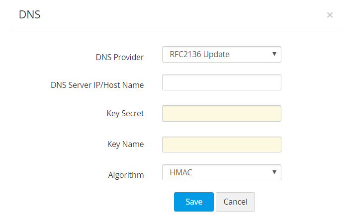 - グローバルDNS構成をRFC2136 DNS更新に選択した場合、ドメイン名自体がゾーン名の機能を持ちます(グローバルDNS構成は同じキーシークレットをすべてのユーザーに使用している場合のみ可能です)。一方、ドメインエージェントマッピングを選択した場合は、ドメインごとにゾーン名、キー名、およびキーシークレットを個別に指定する必要があります。
