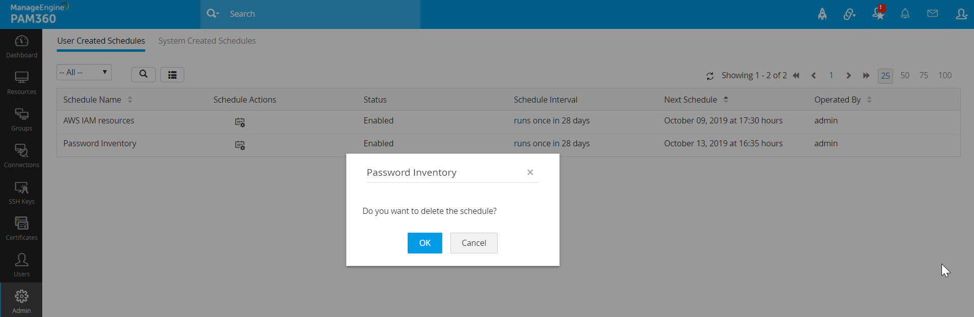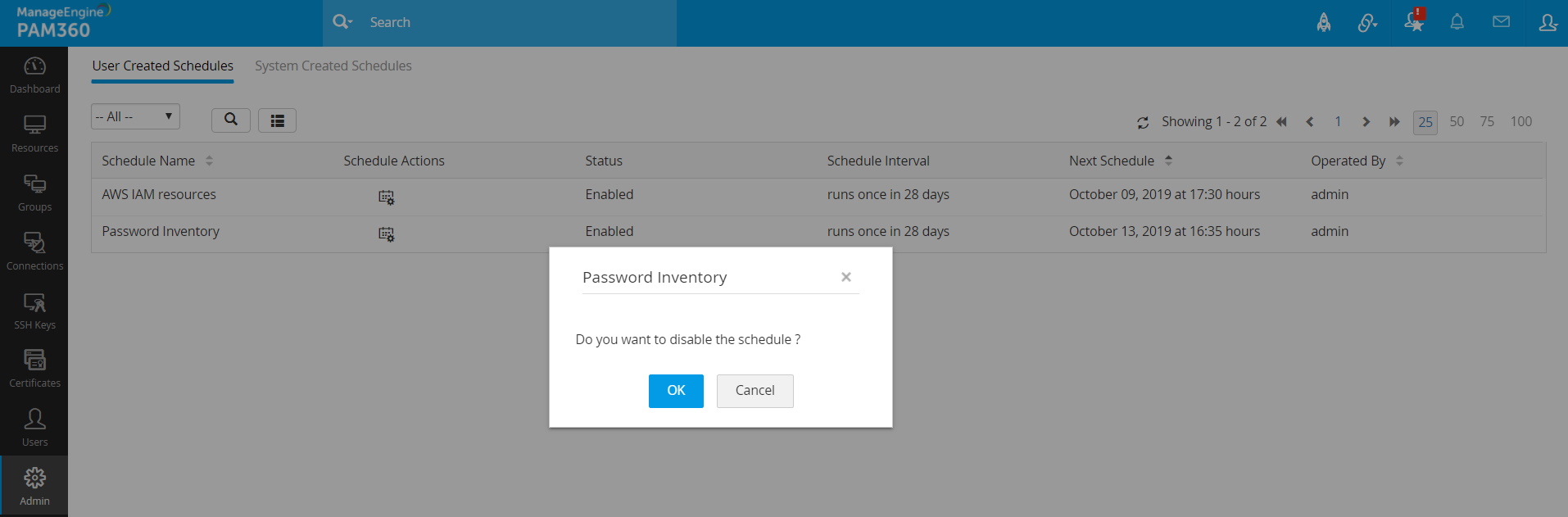 PAM360には、ユーザーとシステムが一回で作成したスケジュールをすぐに表示および編集するオプションがあるため、IT管理者はすべてのスケジュールを簡単に管理できます。ユーザーは、スケジュールを有効化、無効化または削除することもできます。