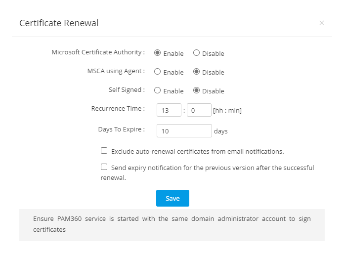 ローカルCAが発行した証明書は、PAM360の 管理者ページから自動更新できます。