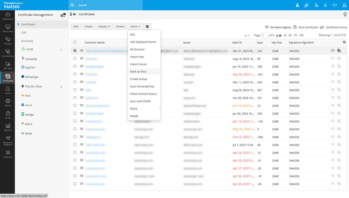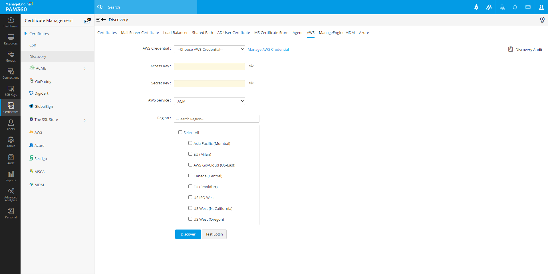 - 証明書が正常に検出され、PAM360中央証明書リポジトリにインポートされます。証明書タブから表示できます。[証明書リストを検出]オプションは、指定されたパスで使用可能なすべての証明書をフェッチし、検出してインポートする証明書を選択するのに役立ちます。
