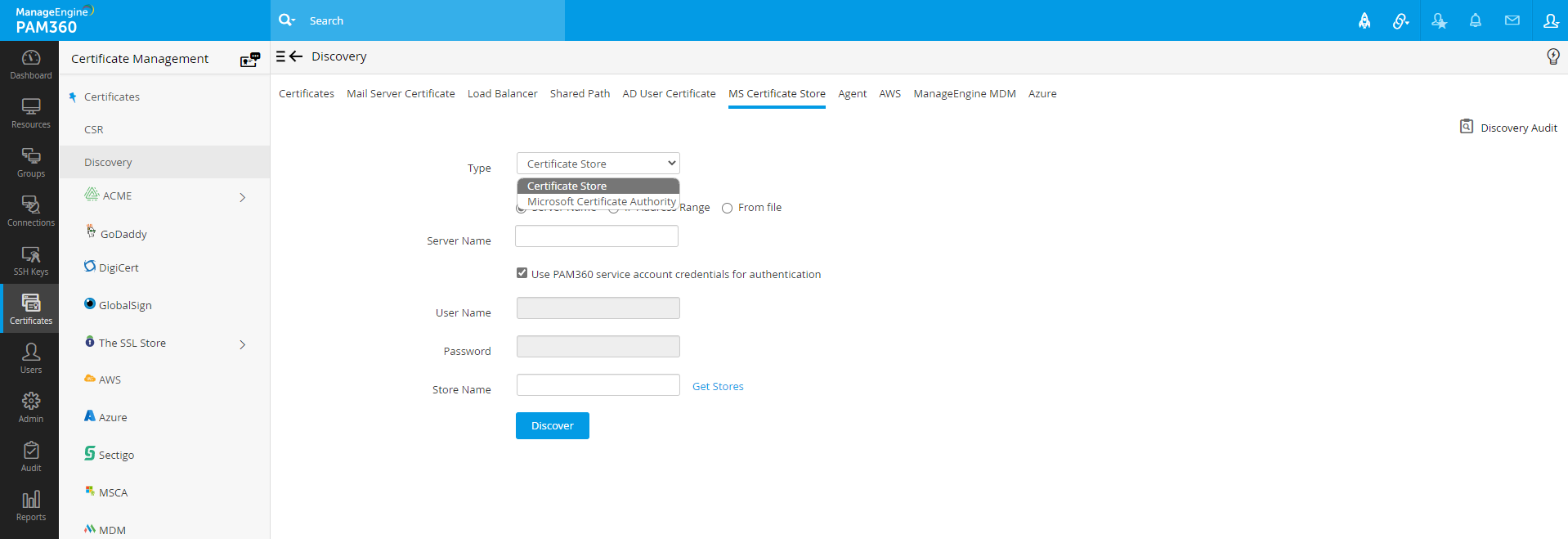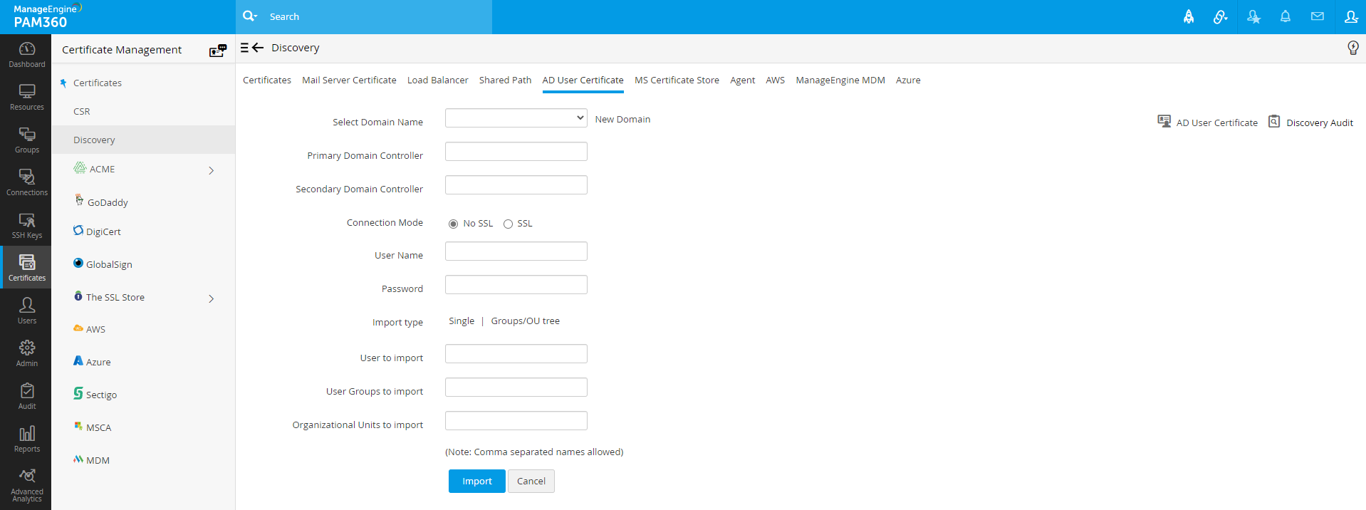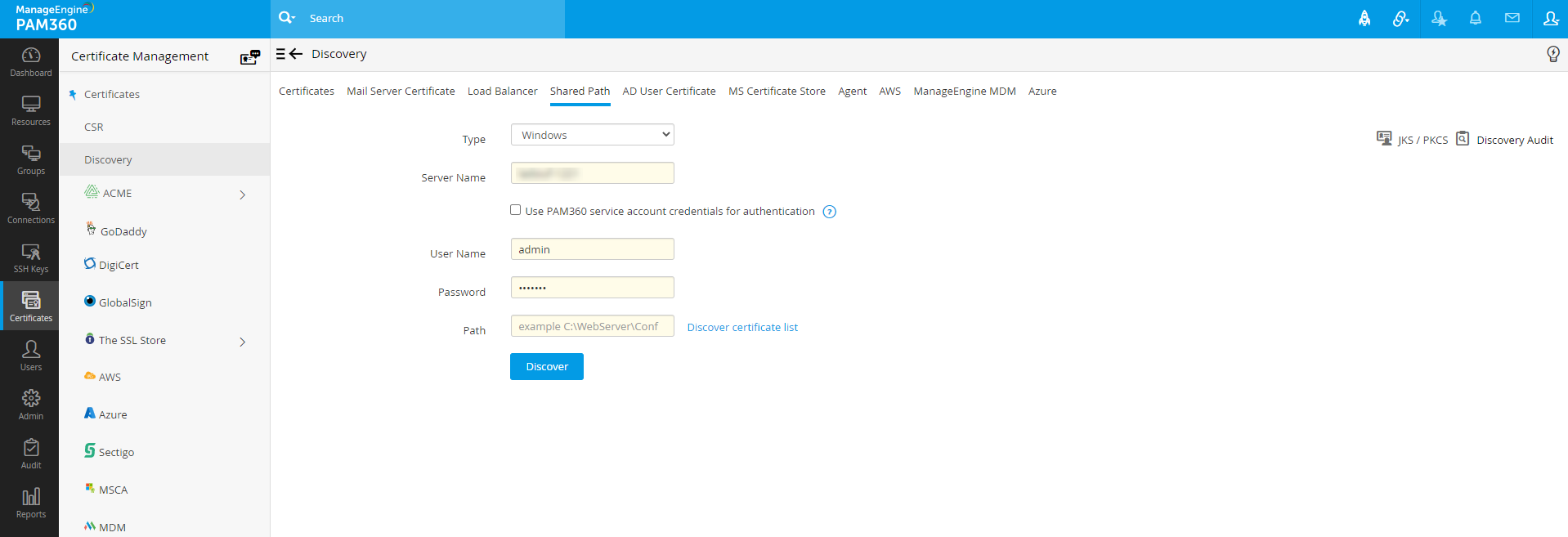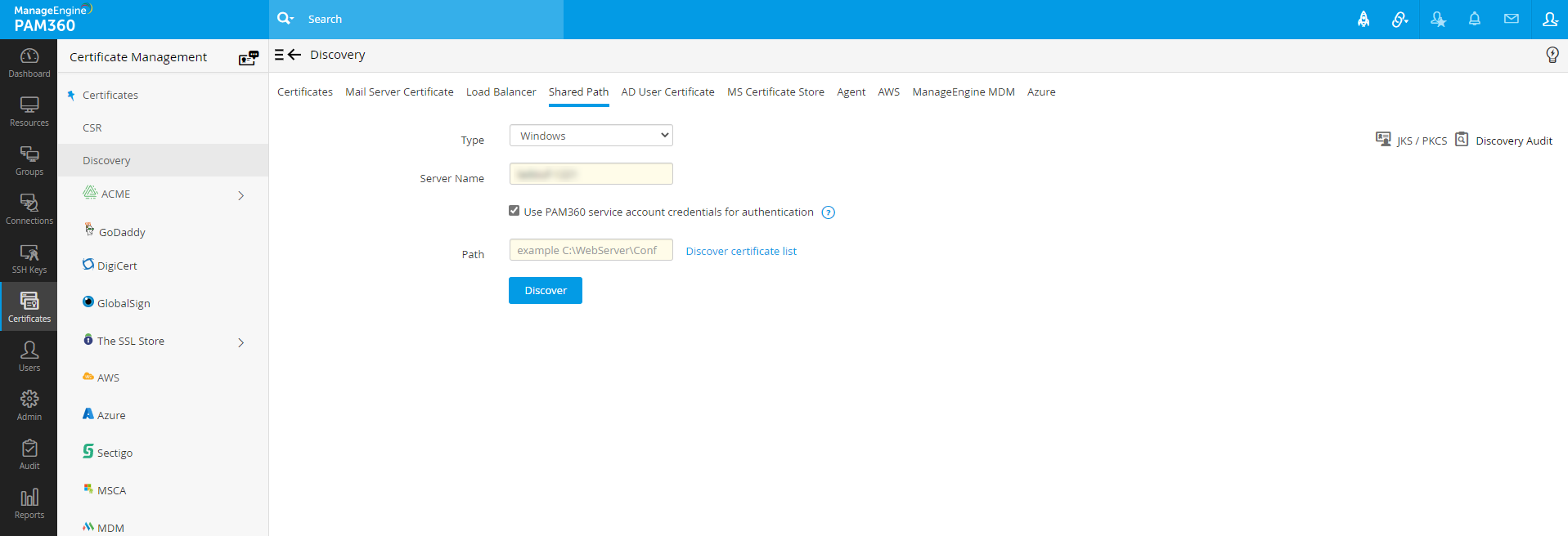 PAM360では、ネットワーク内の共有ディレクトリパスに保存されるSSL証明書を検出でき、セキュア中央リポジトリで結合できます。このオプションを使用すると、特定のフォルダーに保存されているすべての証明書ファイルを検出してから、すべての証明書をリポジトリーに追加するか、インポートする証明書を選択できます。検出プロセス中、PAM360は、パスで指定したフォルダのみをスキャンし、ターゲットマシンの他のいずれ藻スキャンしません。