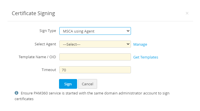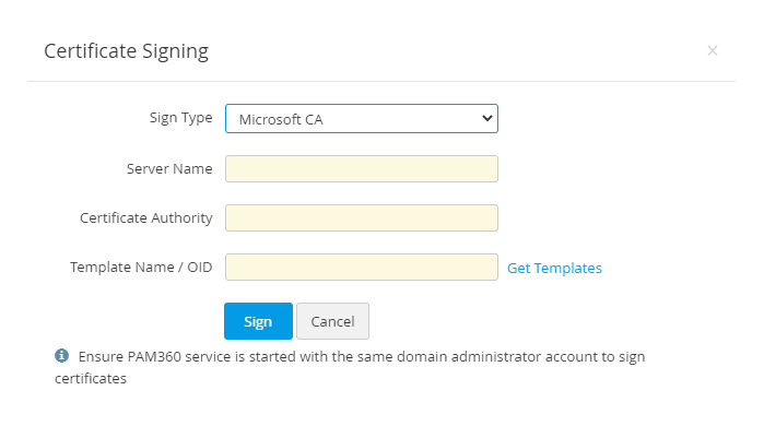 - 更新タイプ、サーバー名、テンプレート名/OID、認証局等の属性が証明書詳細から自動入力されます。サーバー名は、証明書に署名したMicrosoft CAサーバーの名前です。証明機関は、指定されたMicrosoft CAサーバーで実行されるCAサービスです。