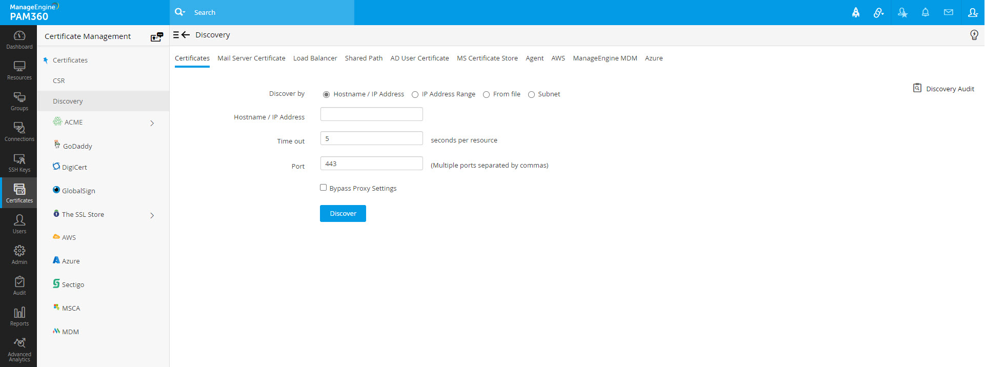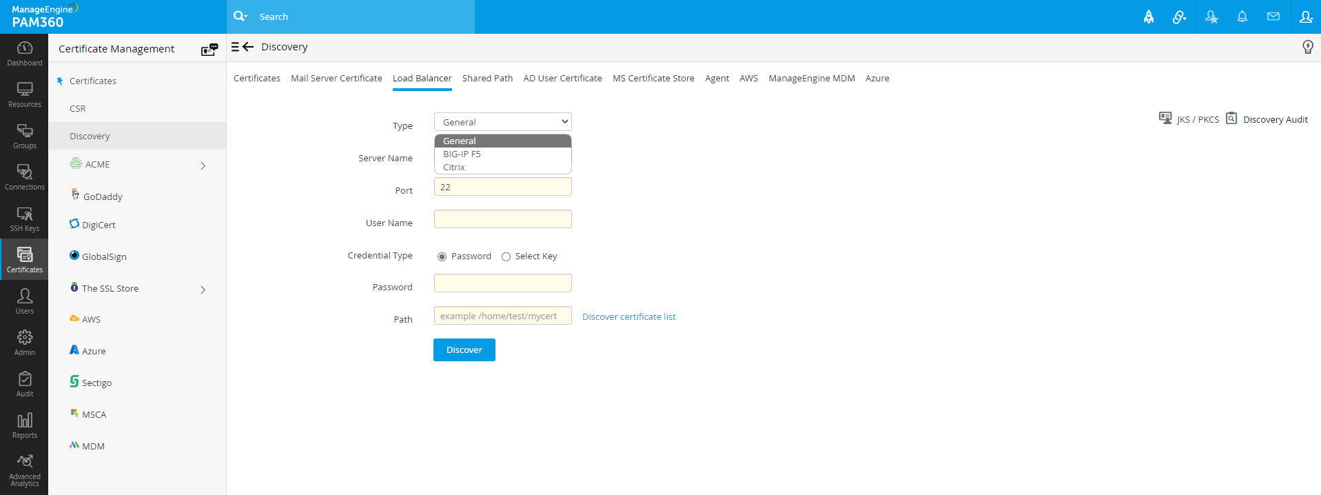 PAM360では、ネットワーク内でロードバランサに展開したSSL証明書を検出でき、それらをセキュア中央リポジトリで結合できます。現時点で、PAM360は、Linuxベースのロードバランサのみの証明書検出をサポート(すなわち、Nginx、F5等)し、そのプロセスは、SSHでトンネリングされます。ロードバランサー証明書の検出を実行するには: