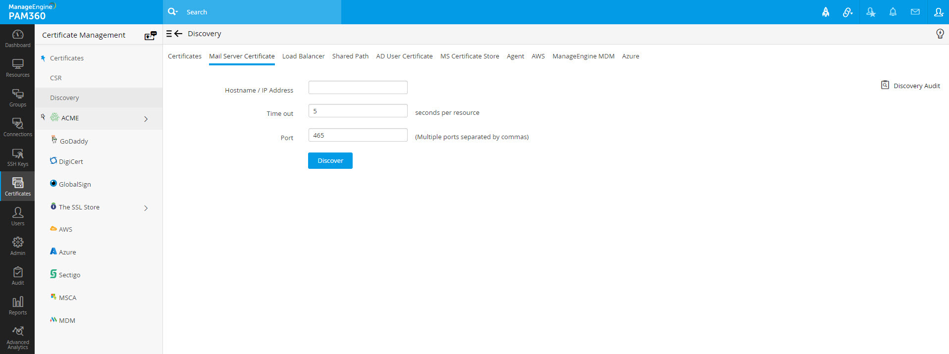 ネットワークにあるメールサーバーが使用するSSL証明書を検出し、それらをPAM360の中央証明書リポジトリで結合できます。メールサーバー証明書の検出を実行するには: