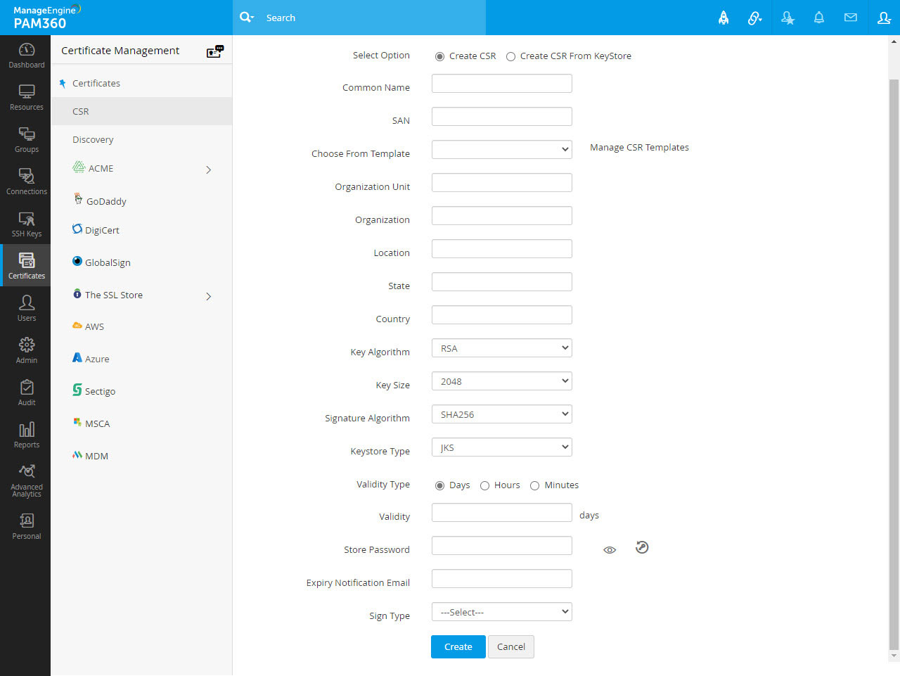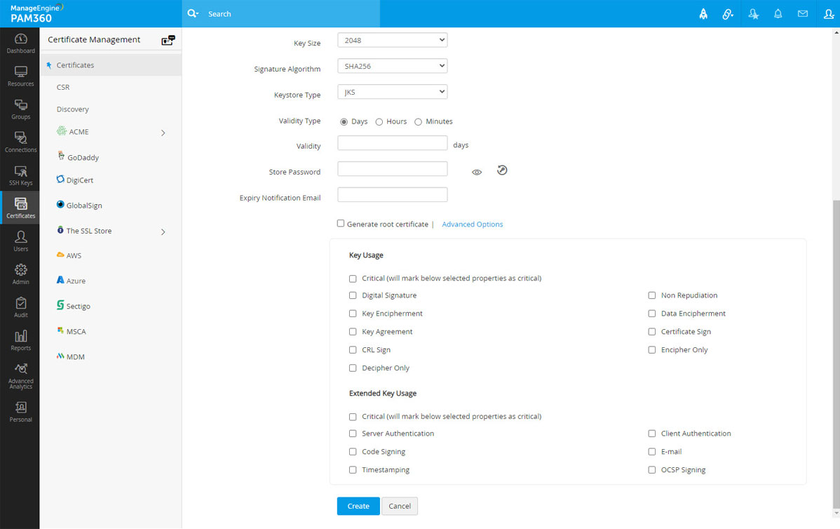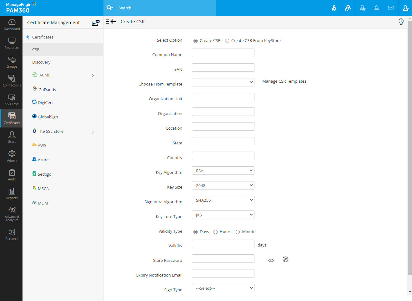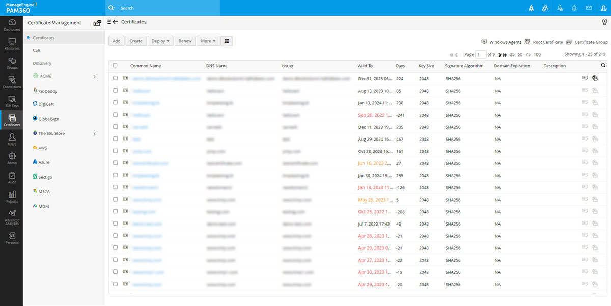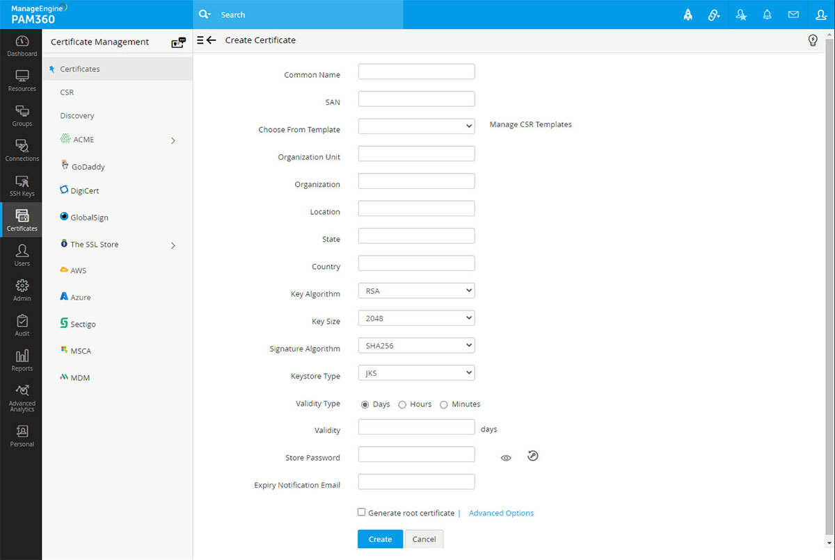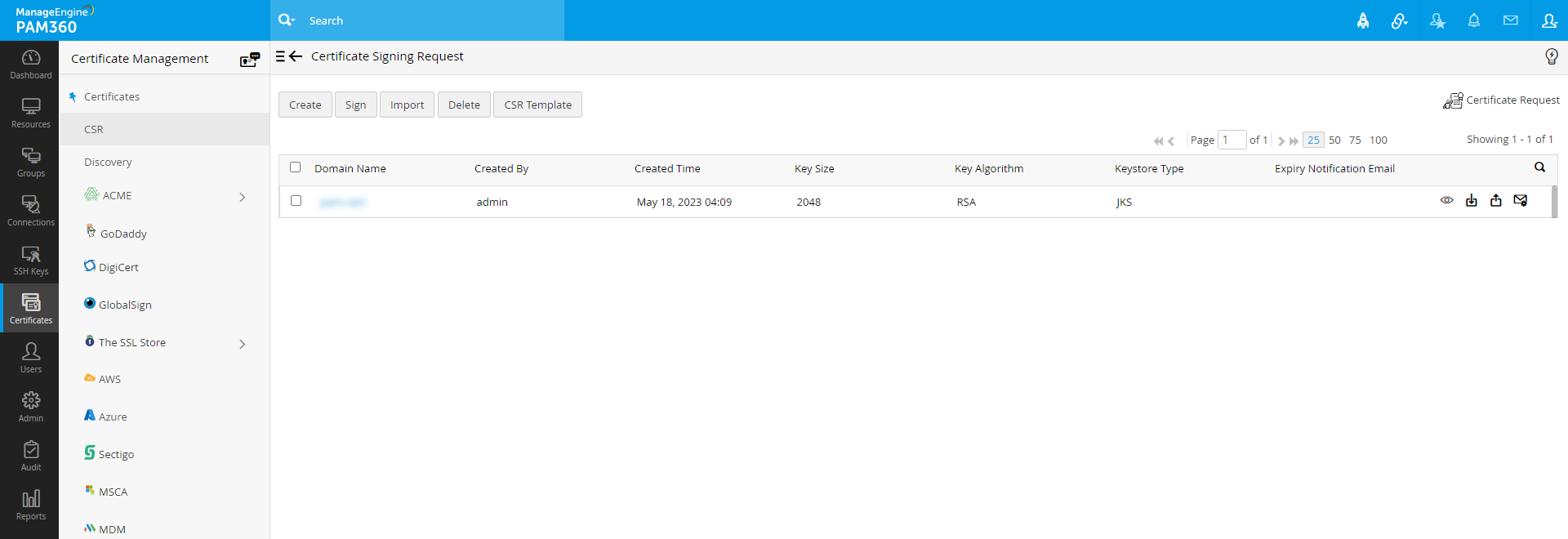 SSL証明書をPAM360の中央リポジトリで作成、検出および保存します。新しい証明書および既存の証明書へのドメイン追加の要求を発生させます。証明書の有効期限が近づくと通知が届き、タイムリーな更新に役立ちます。