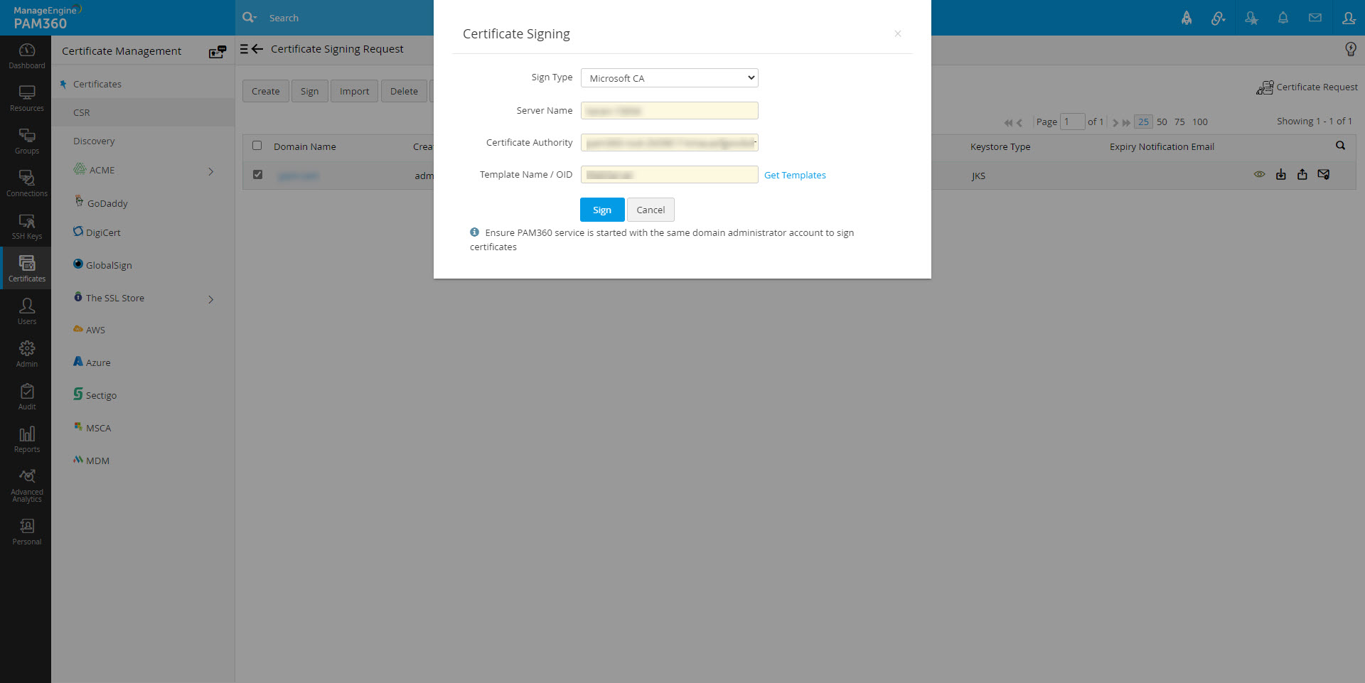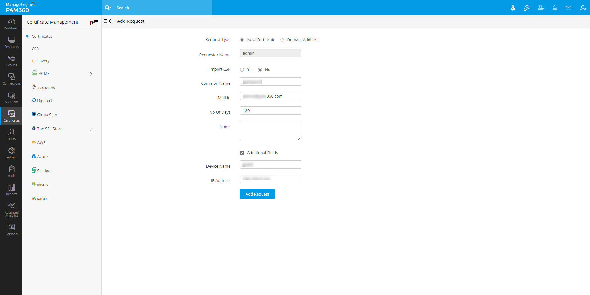 PAM360での新しい証明書に要求を追加または既存の証明書へのサブドメインの追加: