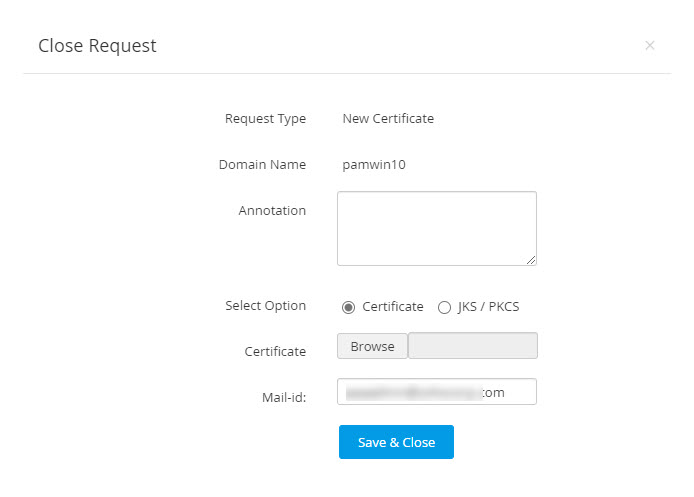 - [要求を閉じる]ウィンドウで、オプションの注釈を追加し、発行された証明書を添付し(オプション)、証明書の送信先のユーザーの電子メールIDを指定して、[保存して閉じる]ボタンをクリックします。ボタンをクリックすると、要求は自動的にクローズ状態に移行します。