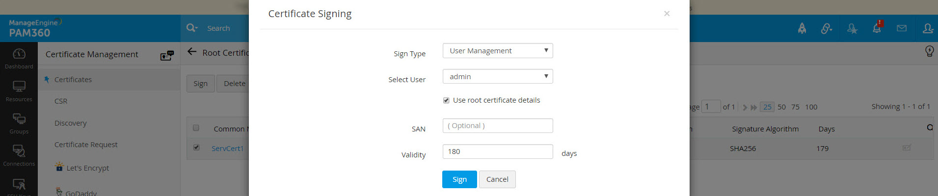 現在使用されていない証明書を削除できます。証明書をPAM360リポジトリから削除するには: