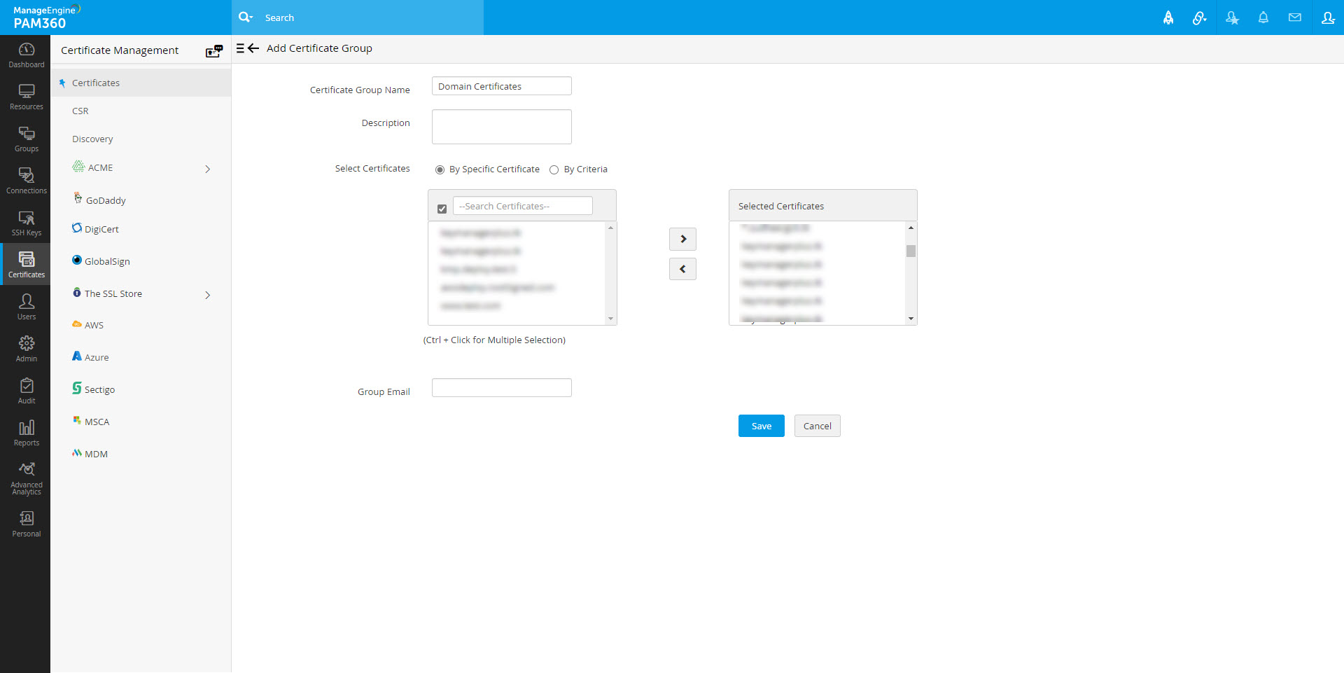 PAM360では、SSL証明書を各種論理グループに整理し、グループの操作を一括で実行できます。