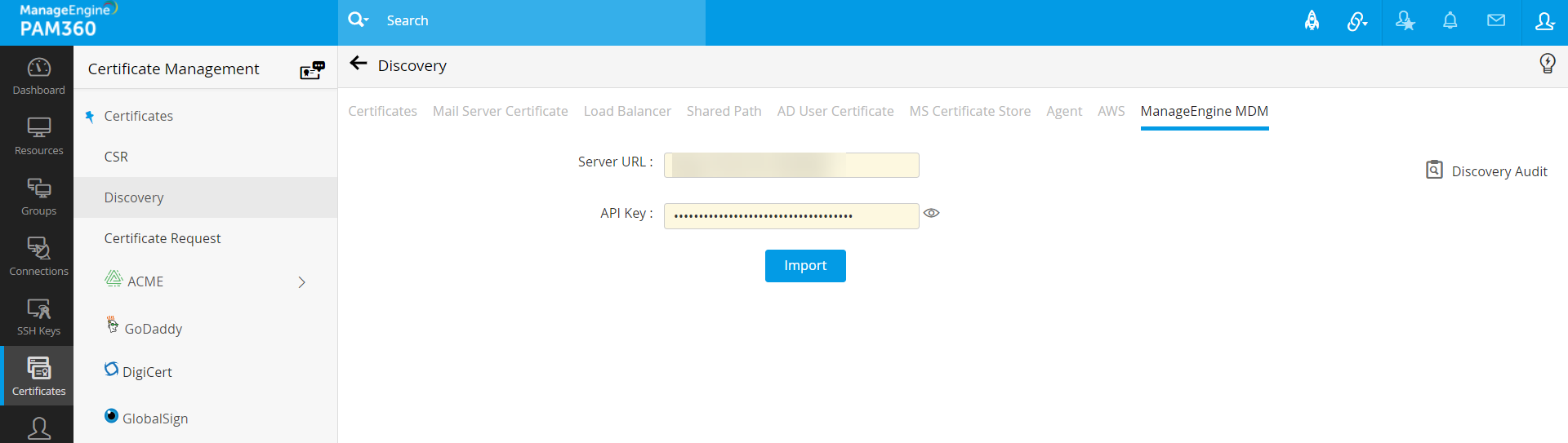 APIサーバーキーをMDMポータルから取得したら、PAM360インターフェイスの下の手順にしたがって、SSL証明書をMDMで管理するデバイスから検出します: