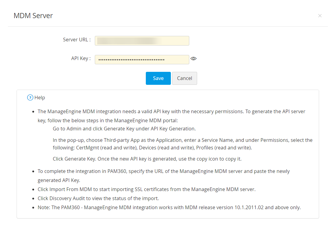 PAM360 - ManageEngine MDM統合には、必要な権限があるAPIキーが必要です。APIサーバーキーを生成するには、ManageEngine MDMポータルの下の手順に従ってください: