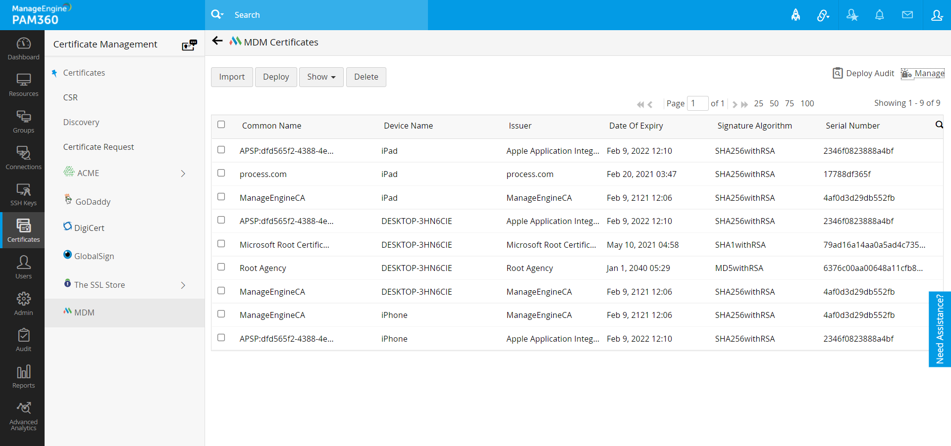PAM360では、SSL証明書を、MDM Serverの各種デバイスに展開できます。以下の手順に従ってください: