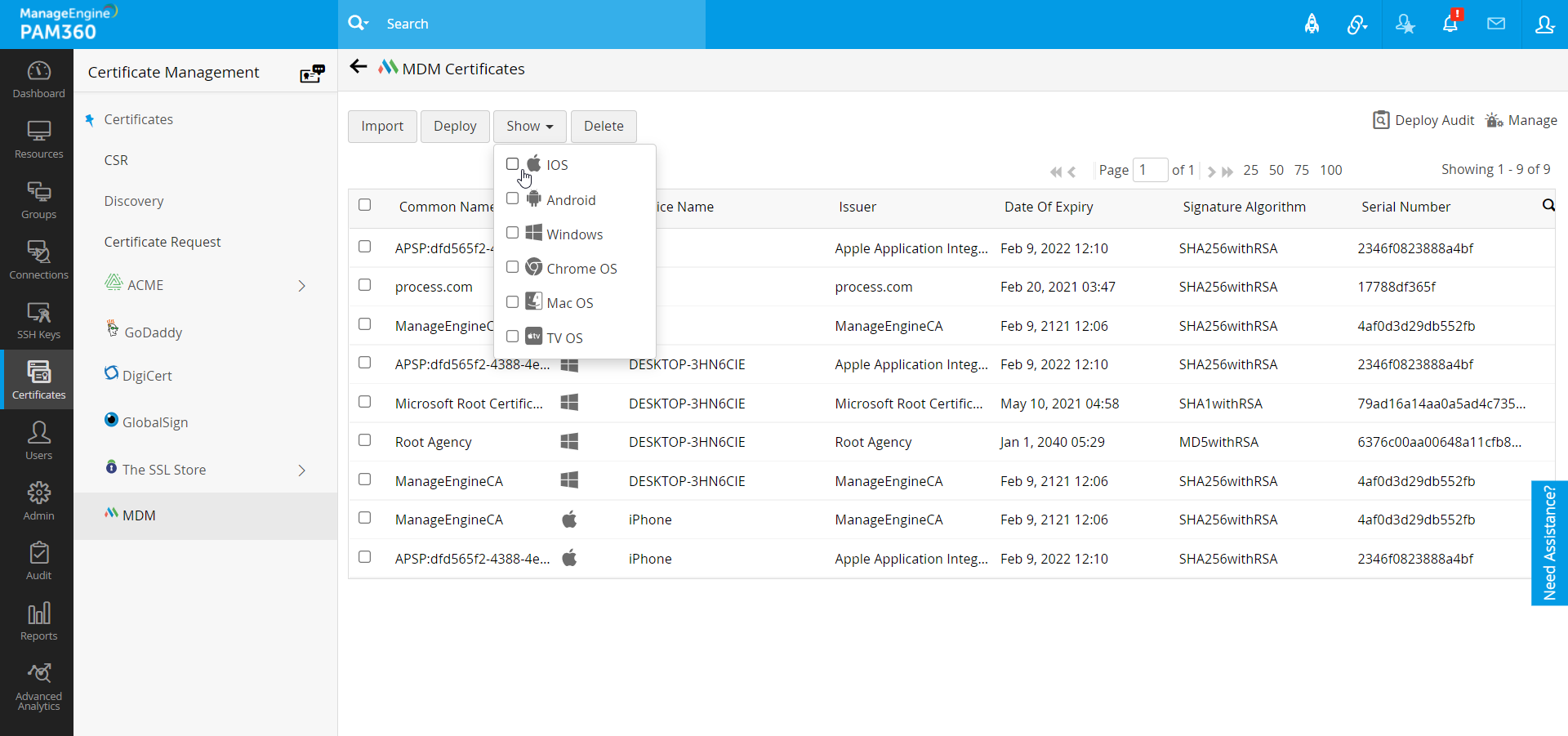 MDMサーバーから検出されたすべてのSSL証明書は証明書リポジトリに保存され、[SSL] >> [ManageEngine MDM]からアクセスできます。ManageEngine MDMタブには、共通名、デバイス名、発行者、有効期限、署名アルゴリズム、シリアル番号などの証明書属性が表示されます。[表示]ドロップダウンを使用すると、iOS、Android、Windows、Chrome OS、Mac OS、およびAppletv OSのOSタイプに基づいてSSL証明書の表示をフィルタリングできます。