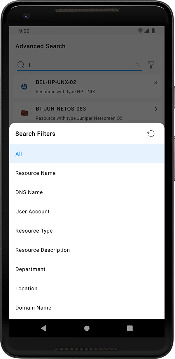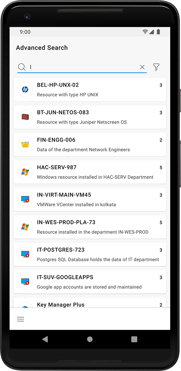 PAM360のAndroidアプリケーションの高度検索は、特定ユーザーまたはリソースをすぐに検索できる便利な機能です。ナビゲーションメニューの[高度な検索]をタップし、名前、部門、場所等のキーワードを入力するか、多数の検索フィルターの1つを使用して検索しやすくします。利用可能な検索フィルターは、リソース名、DNS名、ユーザーアカウント、リソースタイプ、リソース説明、部門、場所、ドメイン名、およびリソースURLです。.これらのデフォルトの検索フィルターに加え、PAM360のデスクトップインストールに追加フィールドを作成した場合、それらのカスタム列名も、高度な検索のフィルターとして表示されます。
