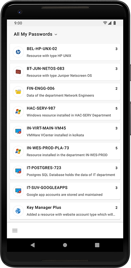 PAM360のAndroidアプリケーションには、デスクトップインストールから離れているときも、特権アカウントを管理dけいる全包括的な機能が付いています。