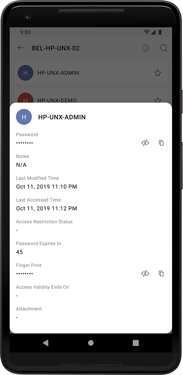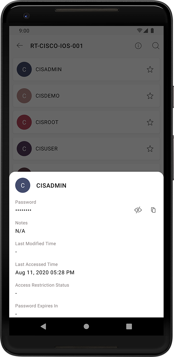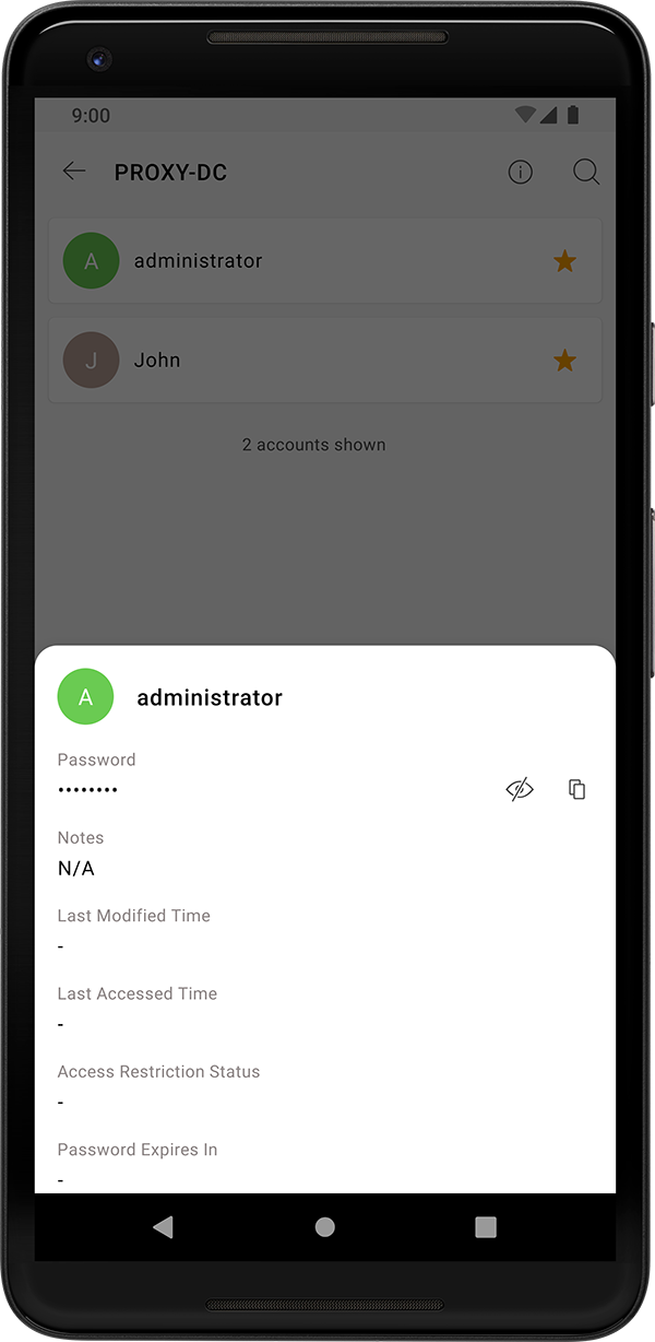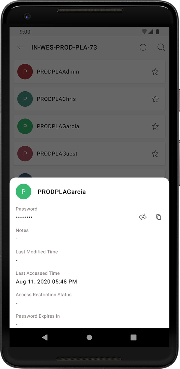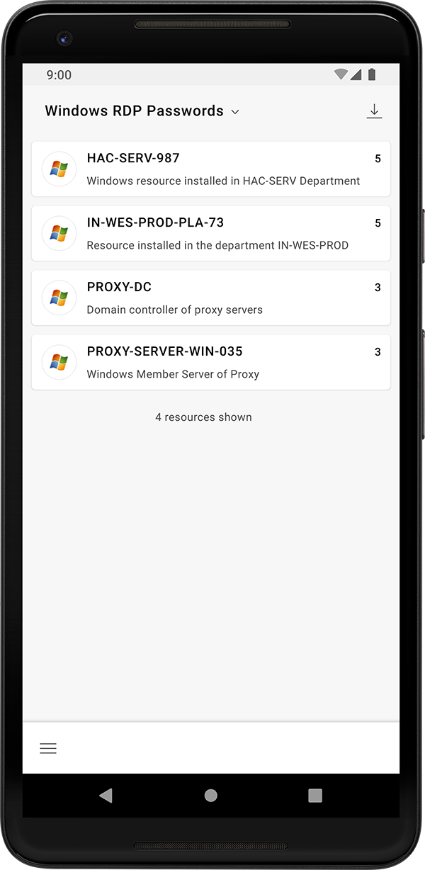 お使いのネットワークにさまざまなOSの種類のリソースのリストが含まれている場合、Windows RDPパスワードオプションでは、Windowsリソースとその対応するアカウントのリストのみを表示できます。リソース/アカウント名をタップして、リソース所有者、リソー スURL、DNS名、リソースの種類、パスワード、リソース名、アカウントメモ、および最期にアクセスした時刻等、リソース/アカウントの詳細を表示します。.特定アカウントのパスワードを表示するには、そのパスワードの横にある[目]アイコンをタップします。