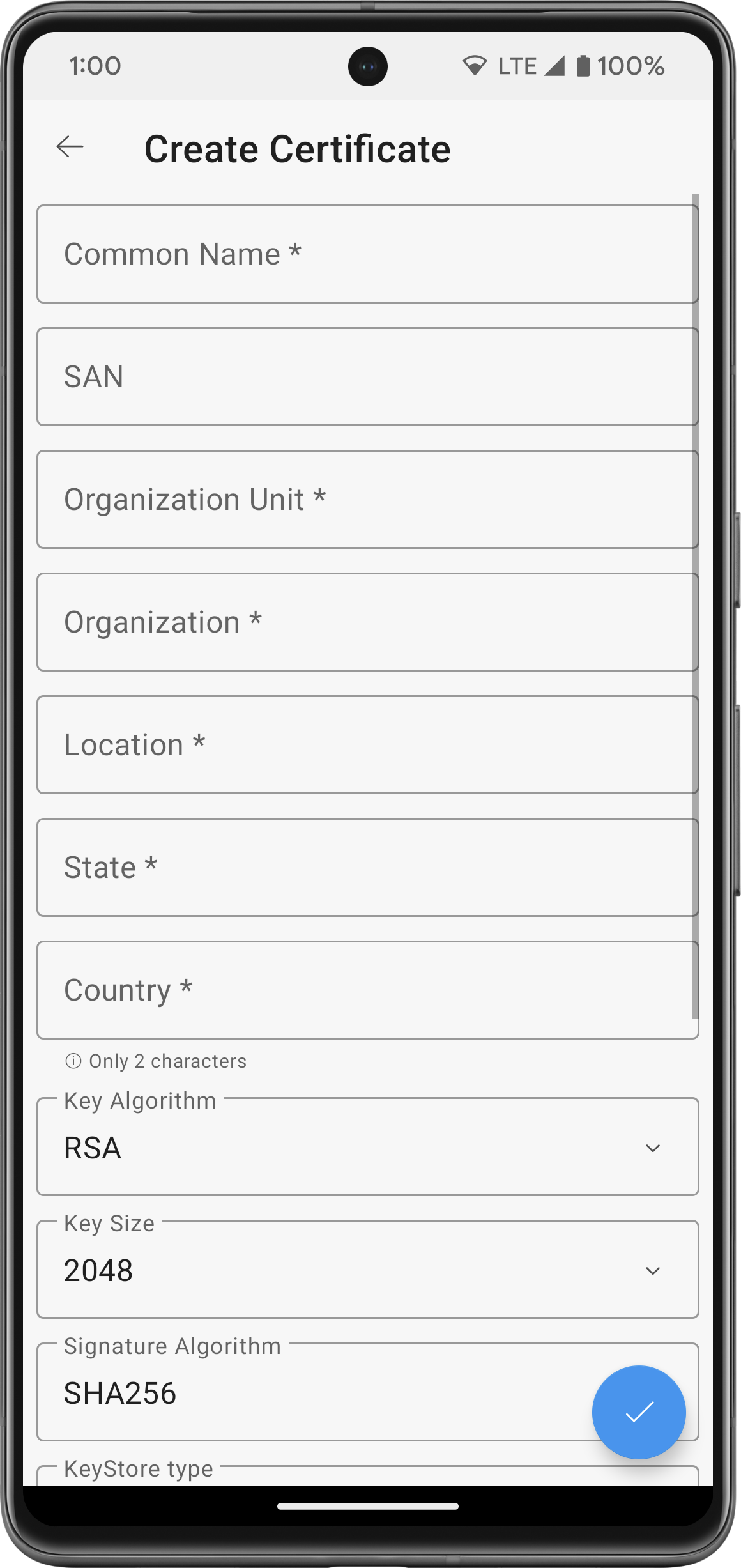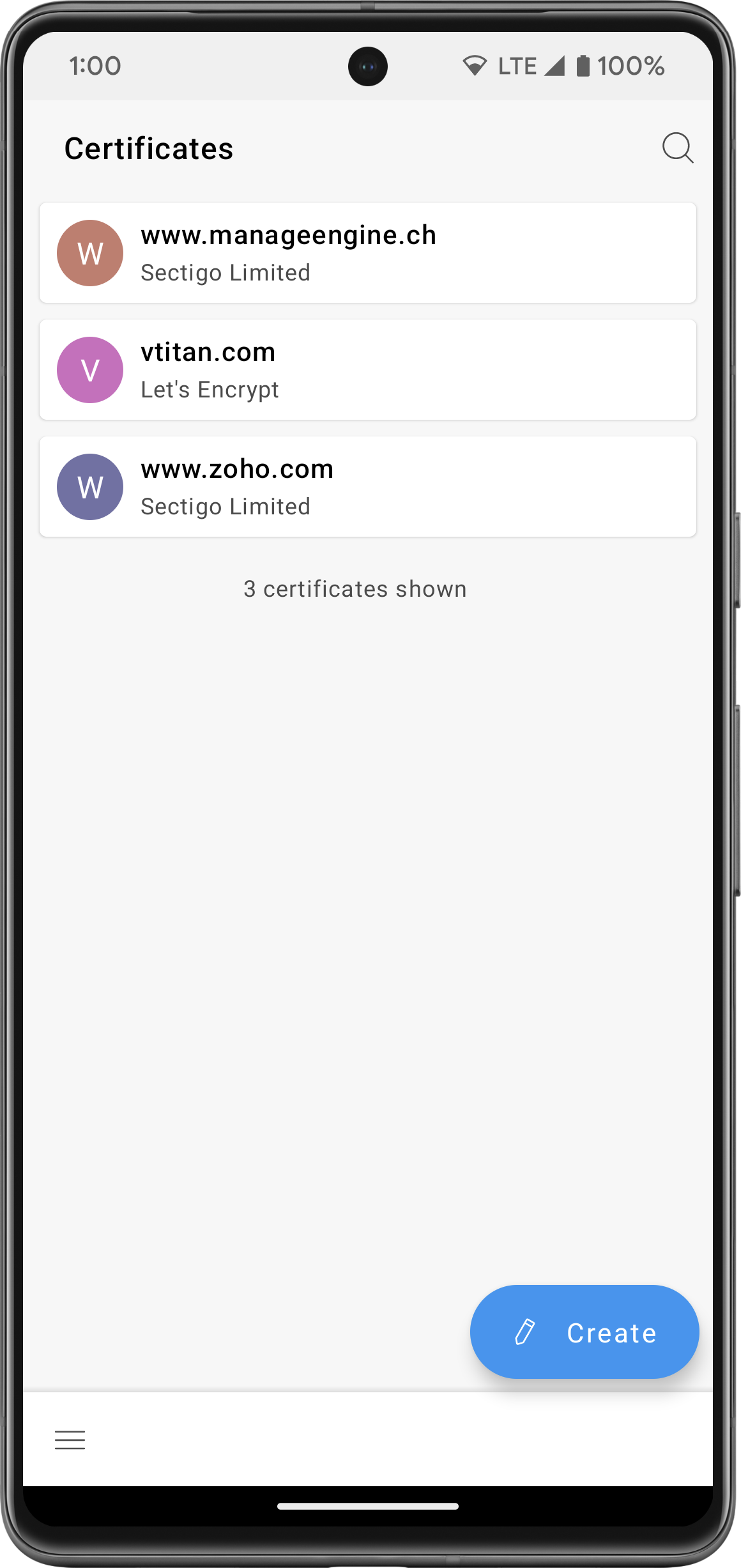 ナビゲーションメニューの証明書オプションをタップし、PAM360リポジトリで管理しているすべてのSSL証明書を表示します。リストのSSL証明書をタップし、以下の証明書詳細を表示します:コモンネーム、ポート、有効期間、SAN、発行者、署名アルゴリズム、指紋、シリアル番号、キーアルゴリズム、キーサイズ、発行者。