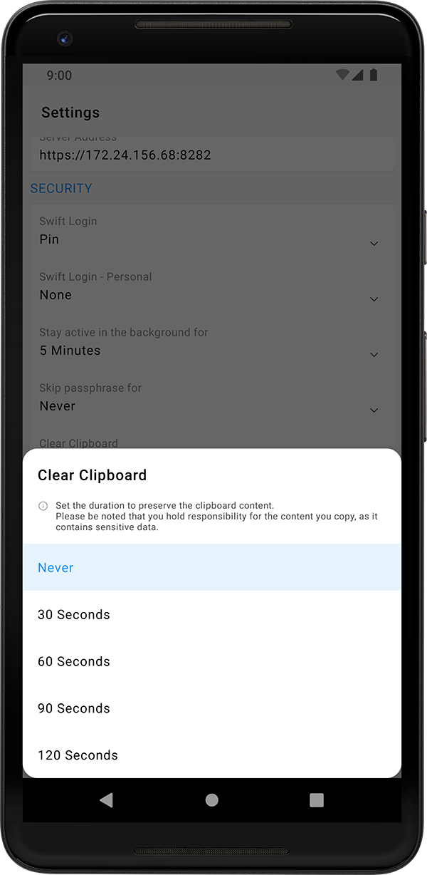 ログアウトしないでアプリケーションを離れる場合、例えば短期間でも、パスフレーズを再入力して復帰するように求められます。アプリケーションが背景で実行されているときに、パスフレーズの入力を求めない期間を設定します。30~120時間の期間を選択できます。また、[しない]をタップすると、ログイン中は必ず、パスフレーズが求められます。v. クリップボードを消去