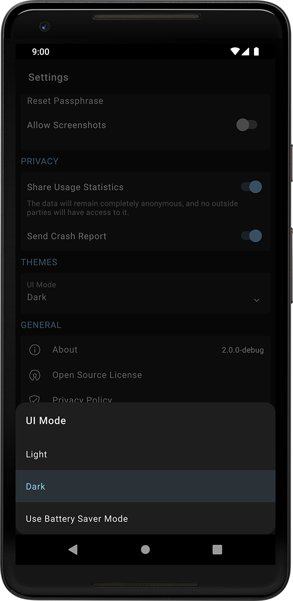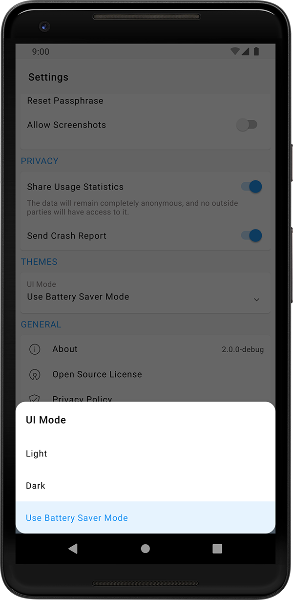 Androidアプリケーションのテーマを変更するには、[テーマ] >> [UIモード]でドロップダウンをタップします。ここで、ライト/ダーク モードを選択するか、電池 セーバーモードの使用を選択できます。