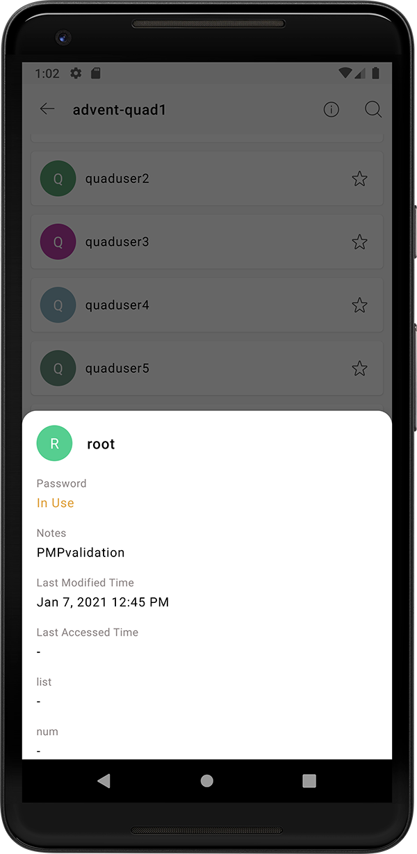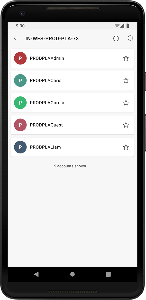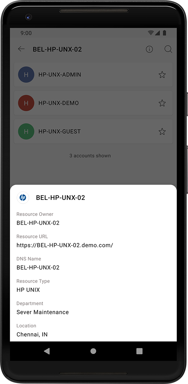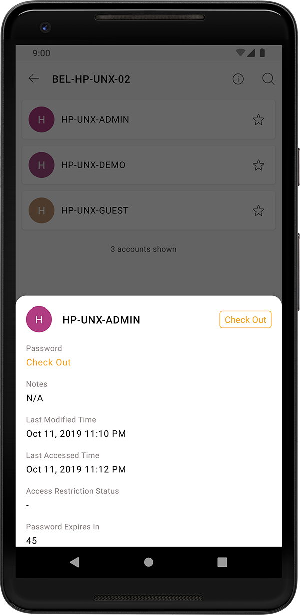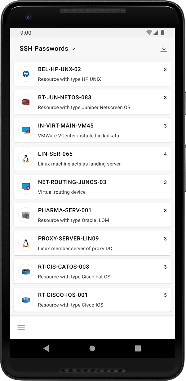 このオプションでは、SSH接続でアクセスできるすべてのリソースの統合ビューが見られます。このリストのリソースをタップして、そのユーザーアカウントを表示します。いずれかのアカウントをタップして、マスキングされたパスワード、最後の修正時刻、最後にアクセスした時刻、およびパスワードの有効期限日等のアカウント詳細を表示します。[検索]アイコンをタップして、検索キーワードを使って、選択したリソース内のアカウントを検索します。