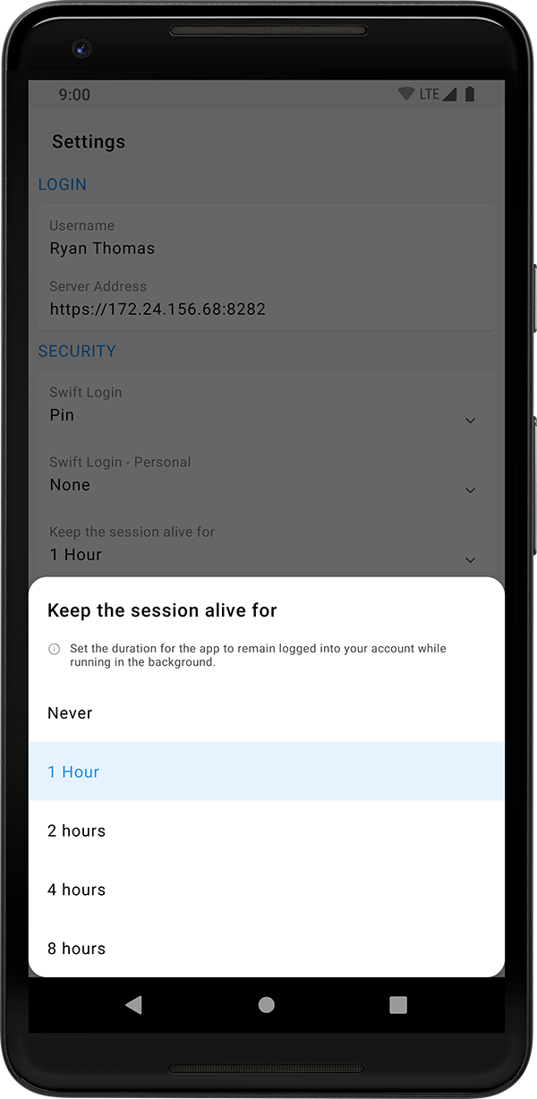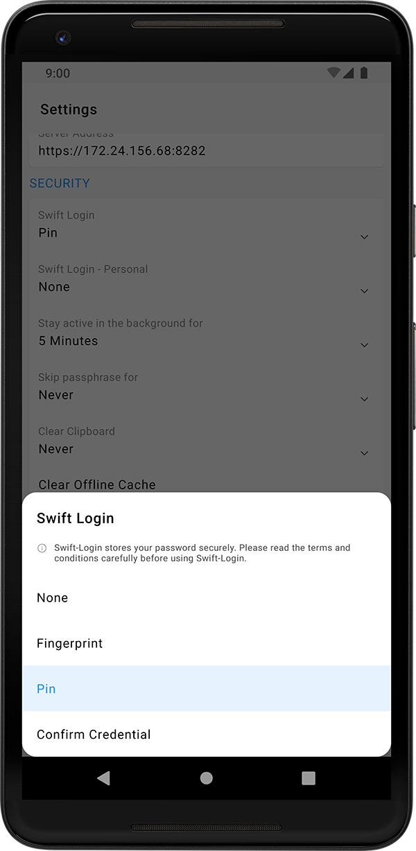 すぐにログインでは、異なる3つの認証方法をセットアップできます: 指紋、Pin、または認証情報利用。このオプションでは、お持ちの電話機でローカル認証を使ってAndroidアプリケーションにすぐにログインします。ii.すぐにログイン - 個人