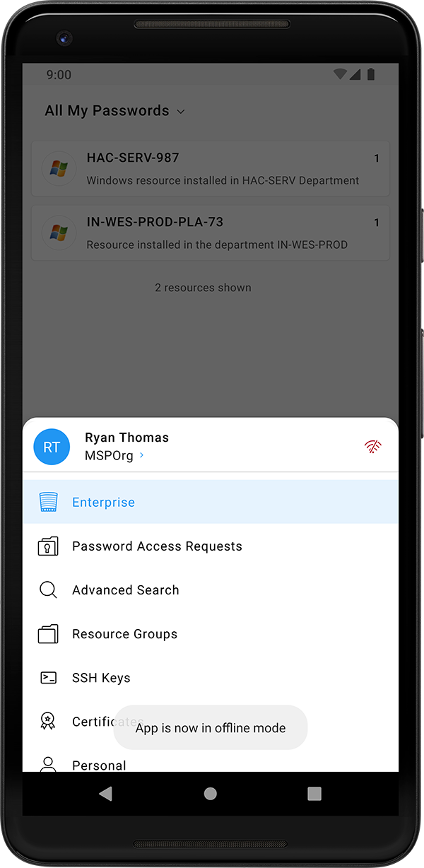 PAM360のAndroidアプリケーションには、インターネットにアクセスしていないときも、パスワードにアクセスできる安全オフラインモードがあります。
