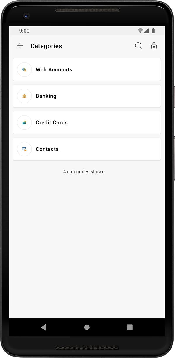 このオプションでは、お気に入りとしてマークしたパスワードのリストにクイックアクセスできます。パスワードをお気に入りとしてマークするには、いずれかのカテゴリの必要なパスワードの横にある[星]アイコンをタップします。パスワードをお気に入りとしてマークすると、特定のアカウントとそのパスワードを簡単に探すことができるため、リスト全体を毎回スクロールする必要がありません。[検索]アイコンをタップして、検索キーワードを使って、選択したリソース内のアカウントを検索します。