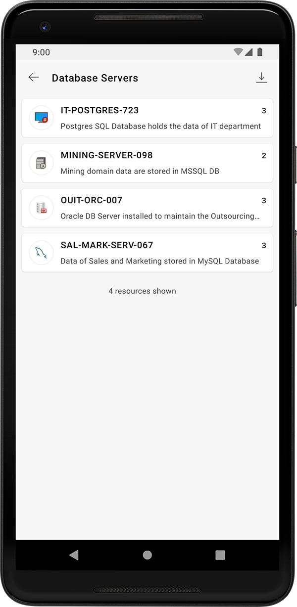 MSPユーザーの場合は、PAM360のAndroidアプリケーションで、すべてのクライアントの管理パスワードを単一管理コンソールから個別に管理できます。アプリケーションがクライアント組織を異なるセクションに適切に分離するため、その特定組織に属するすべてのパスワードをタップして表示することができます。MSP管理者として、管理する組織の名前を表示でき、リソースを追加するか、そのリソースをあなたが共有する場合のみ、顧客すべてのデータを表示できるようになります。クライアントは、各組織に属しているデータのみを表示できるようになります。