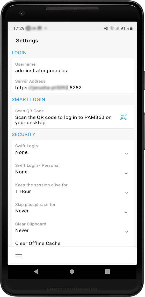 ログインセクションには、PAM360が現在接続されているユーザー名とサーバーアドレスが表示されます。お使いの環境で高可用性機能をオンにしている場合、Androidアプリケーションには、設定ページにセカンダリサーバーの詳細も表示されます。プライマリサーバーがダウンした場合、サービスが中断しないように、セカンダリサーバーに接続することができます。