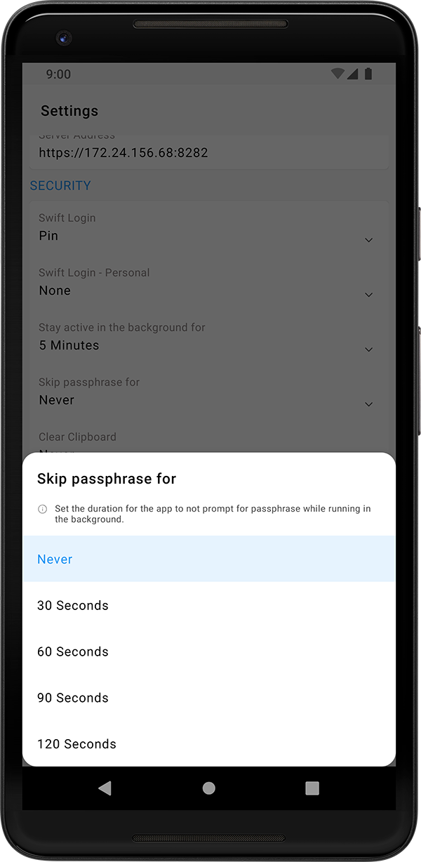 アプリケーションが背景稼働になったとき、アプリケーションがお使いのアカウントにどのくらいの期間ログインした状態にするかの期間を設定します。1~8時間の期間を選択できます。このオプションは、PAM360と他のアプリの間で短時間中に複数回切り替える場合に役立ちます。また、[しない]をタップすると、アプリケーションが背景稼働になるとすぐに、ログアウトします。iv.パスフレーズをスキップ