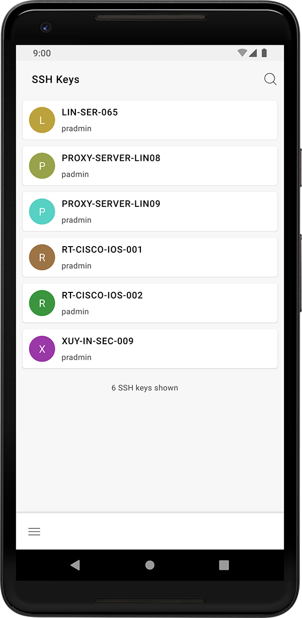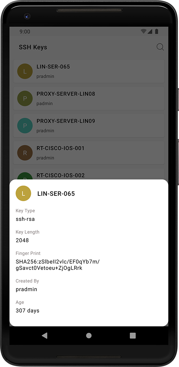 ナビゲーションメニューのSSHキーオプションをタップし、PAM360リポジトリで管理しているすべてのSSHキーを表示します。SSHキーをタップし、キータイプ、キー長、キーの指紋、キーを作成したユーザー名、およびキーの年齢等、キーの詳細を表示します。