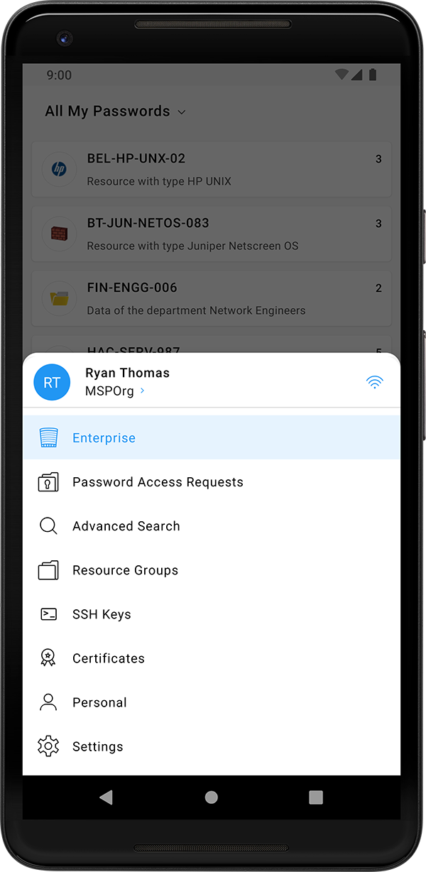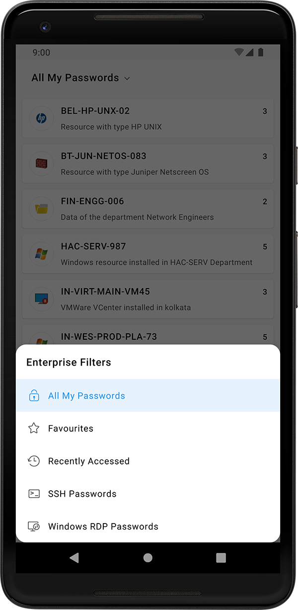 デフォルトでは、アプリケーションには、メイン画面にすべてのリソースのリストが表示されます。ここから、いずれかのリソースをタップして、そこに関連づけられたアカウントを表示します。左端下にある[ハンバーガー]アイコンをタップして、エンタープライズメニューを開きます。このメニューで、[エンタープライズ]オプションをタップし、すべてのマイパスワードページを開きます。エンタープライズフィルターを表示するには、すべてのマイパスワードの横の下向き矢印をタップします。エンタープライズフィルターには、あなたが所有または管理するリソースのリストが、下のようにカテゴリ化されて表示されます: