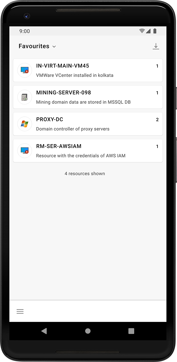 このカテゴリには、あなたが所有および管理するすべてのリソースとアカウントが一覧表示されます。リソース/アカウント名をタップして、リソース所有者、リソー スURL、DNS名、リソースの種類、パスワード、リソース名、アカウントメモ、および最期にアクセスした時刻等、リソース/アカウントの詳細を表示します。.特定アカウントのパスワードを表示するには、そのパスワードの横にある[目]アイコンをタップします。[検索]アイコンをタップして、検索キーワードを使って、選択したリソース内のアカウントを検索します。