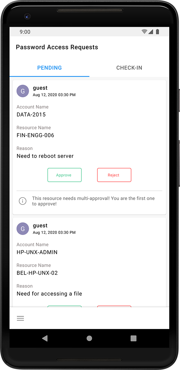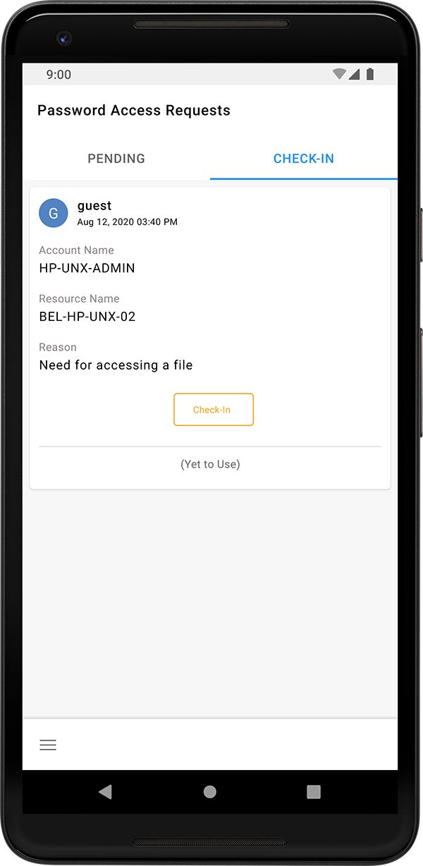 パスワードアクセス要求を送信するには、アカウント詳細セクションで、[要求]オプションをタップします。要求が通過したら、ステータスは承認待ちに変更されます。管理者がパスワード要求を承認したら、その旨通知され、パスワードはチェックアウトで利用できるようになります。.使用するためパスワードをチェックアウトしたら、ステータスは使用中に変更されます。他のユーザーは、チェックインタブと、特定アカウントのアカウント詳細セクションの両方でこのステータス変更を確認できます。パスワードへのアクセスをやめるには、[チェックイン]オプションをタップします。これで、パスワードはPAM360 vaultでのチェックインに戻ります。