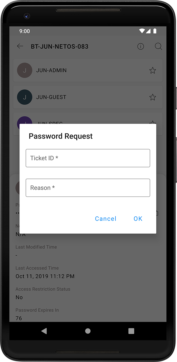 パスワードをチェックインしアクセスを諦めた場合で、再アクセスが必要な場合、要求‐解除ワークフローをもう一度行う必要があります。PAM360のAndroidアプリケーションは、チケット発券デスク統合をサポートしています。統合により、PAM360は、ユーザーにチケットIDを要求とあわせて入力するよう求めます。次に、PAM360は、ユーザーが入力したチケットIDが発券システム内に存在するかどうかを確認して初めて、ユーザーにパスワード表示のためのアクセス権を付与します。