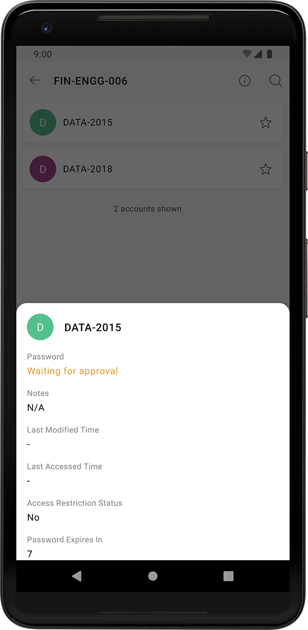 PAM360には、管理者が特定期間、ユーザーにパスワードアクセスを許可するアクセスコントロールメカニズムがあります。管理者は、パスワードの共有準備ができた段階で、専用の権限の付与を開始でき、1人のユーザーのみ、1つのポイントで特定のパスワードを時間どおりに使用することができます。PAM360のAndroidアプリケーションから、管理者は、他のユーザーの保留中のパスワードアクセス要求のリストを表示し、それに基づいて操作できます。