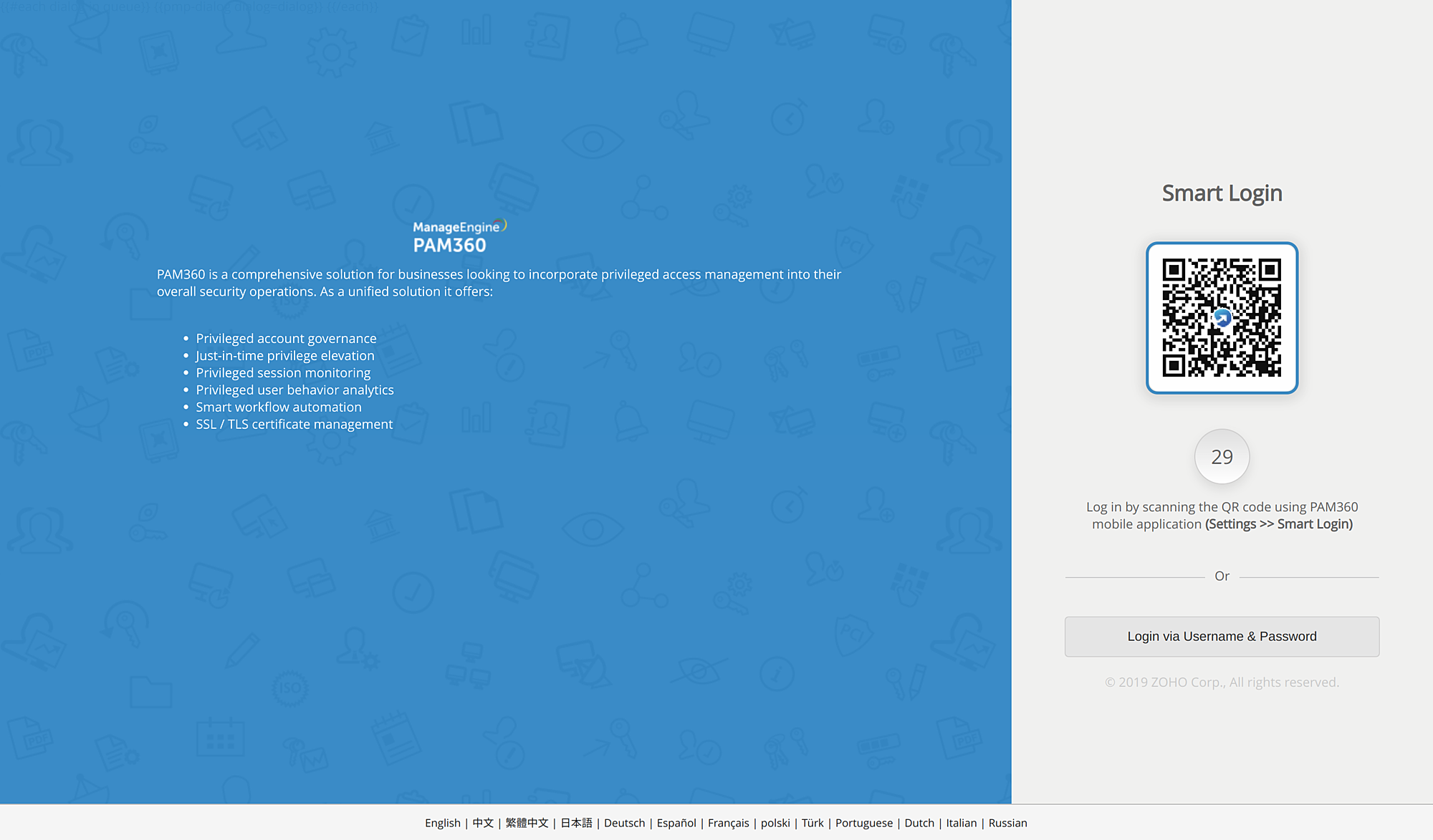 スマートログイン機能では、PAM360 WebぺページにあるQRコードをスキャンするだけで、PAM360 Webインターフェイスにシームレスアクセスできます。この直接ログイン方法では、プロセスが整理され、パスワードの認証が少なくなり、Webログインに必要な手間が大幅に少なくなりますが、その間、堅牢なセキュリティ対策は維持されます。