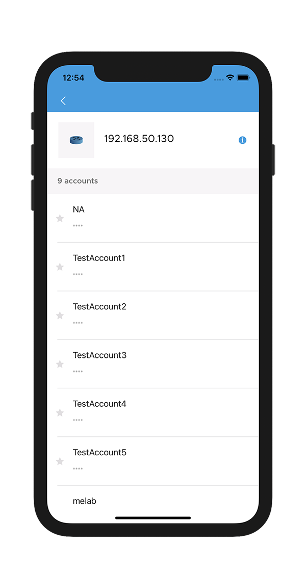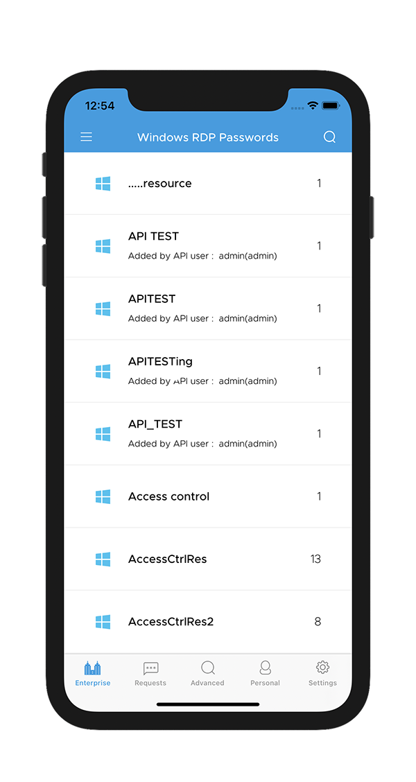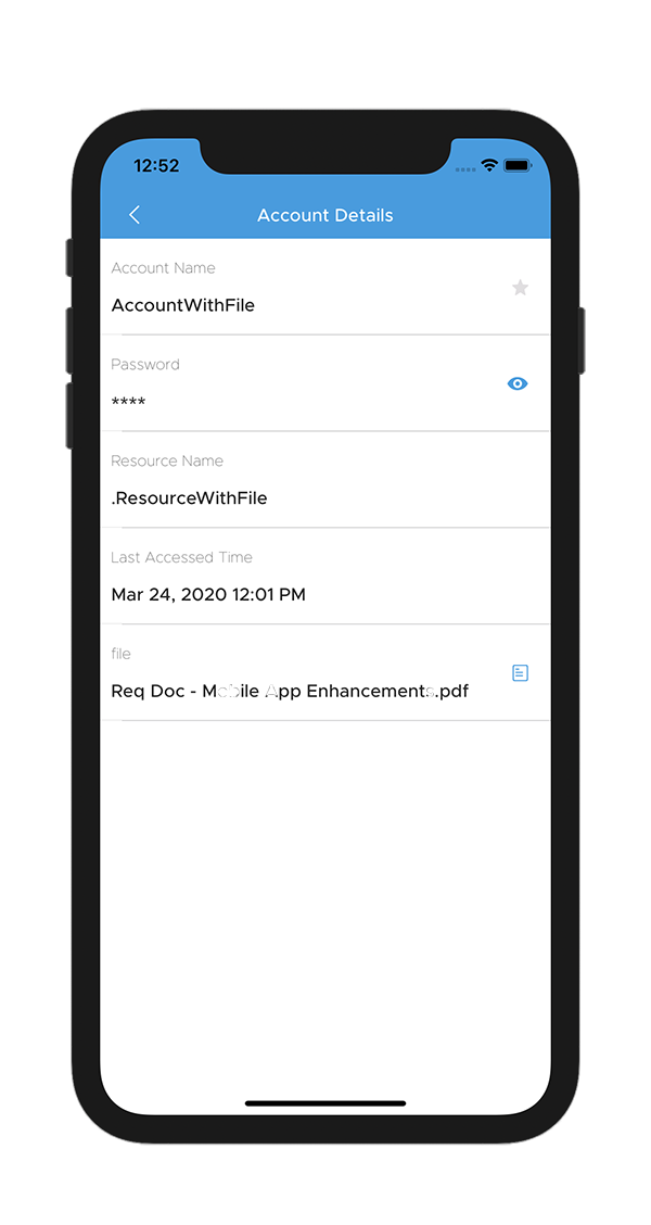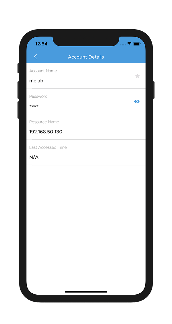 お使いのネットワークにさまざまなOSの種類のリソースのリストが含まれている場合、Windows RDPパスワードオプションでは、Windowsリソースとその対応するアカウントのリストのみを表示できます。リソース/アカウント名をタップして、リソース所有者、リソー スURL、DNS名、リソースの種類、パスワード、リソース名、アカウントメモ、および最期にアクセスした時刻等、リソース/アカウントの詳細を表示します。.特定アカウントのパスワードを表示するには、そのパスワードの横にある[目]アイコンをタップします。