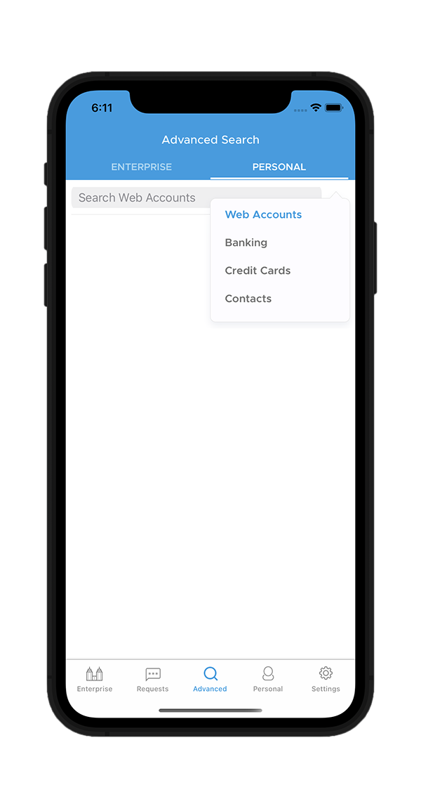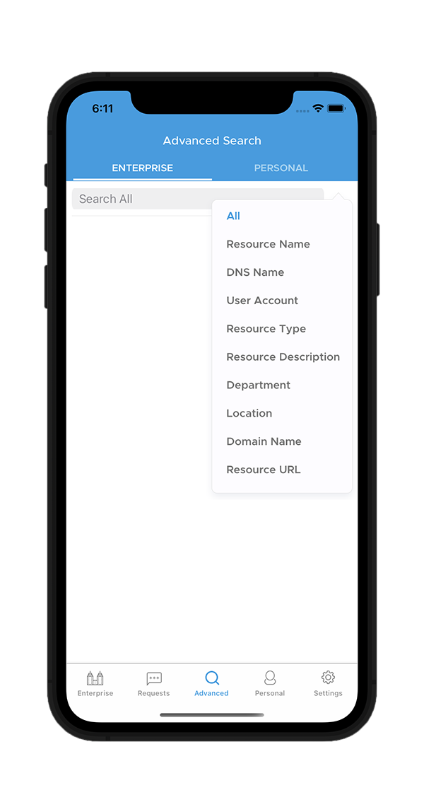 PAM360のiOSアプリケーションの高度検索は、特定ユーザーまたはリソースをすぐに検索できる便利な機能です。ナビゲーションメニューの[高度]をタップし、名前、部門、場所等のキーワードを入力するか、多数の検査フィルターの1つを使用して検索しやすくします。高度検索セクションには、以下の2つの個別タブがあります:エンタープライズと個人。エンタープライズセクションでは、検索フィルターを使って、検索を個別設定できます。利用可能な検索フィルターは、リソース名、DNS名、ユーザーアカウント、リソースタイプ、リソース説明、部門、場所、ドメイン名、およびリソースURLです。個人セクションでは、利用可能な検索フィルターは、Webアカウント、銀行情報、クレジットカードおよび連絡先です。これらのデフォルトの検索フィルターに加え、PAM360のデスクトップインストールに追加フィールドを作成した場合、それらのカスタム列名も、高度検査k鵜ページのフィルターとして表示されます。例えば<Personal>PAM360のタブには、保存する情報にタグを追加するオプションが付いています。これらのタグをキーワードとして使って、高度検索ページの個人セクションでデータを検索します。