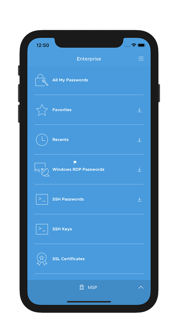エンタープライズと個人の横のトグルボタンは、PAM360アプリケーションが現在、オンラインまたはオフラインモードになっているかを示します。PAM360のiOSアプリケーションには、インターネットにアクセスしていないときも、パスワードにアクセスできる安全オフラインモードがあります。オフラインモードでパスワードにアクセスするには、初めに、必要なパスワードをダウンロードします。オフラインにする前にダウンロードしたパスワードのみ、オフラインモード時のアクセスに利用できます。個別パスワードのダウンロード以外に、お気に入り、最近、Windows RDPパスワード、およびSSH.パスワード等、エンタープライズメニューからパスワードのグループをダウンロードできます。 このほか、リソースグループおよび個人パスワードをダウンロードすることができます。オフラインアクセス用にパスワードをダウンロードするには、エンタープライズメニューに移動し、パスワードの必要なリストの横にある[ダウンロード矢印]をクリックします。